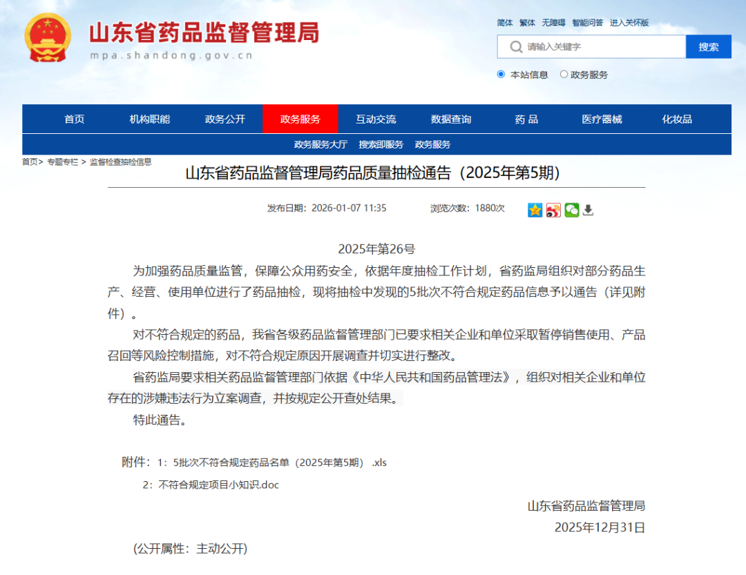 警惕!山东省2025年第5期药品质量抽检不合格名单公布,德州齐河一药房被通报
