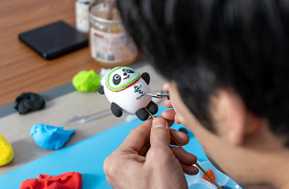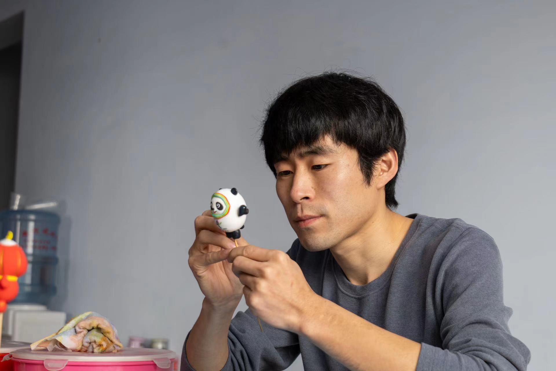 杨予以超轻黏土为主料,通过揉、搓、捏、切、印、划等不同手法,快速制作完成冰墩墩、雪容融的基本形态,并用不同色彩的颜料勾勒、描画出细节部分。为了让冰墩墩、雪容融更加地生动活泼,杨予通过喷油的方式给冰墩墩加上了一件透明外衣,用“化妆术”给雪容融增加了腮红等。
