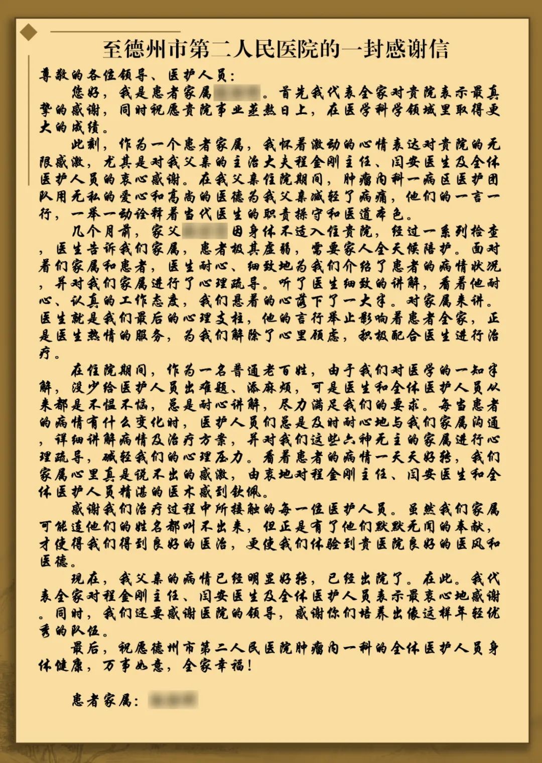 日前,德州市第二人民医院肿瘤内科一病区收到了赵先生一家的感谢信。在信中,赵先生表达了对自己病情康复的激动心情,同时对自己在住院期间肿瘤内科一病区全体医护人员高超的医术和细致周到的服务表达了真挚的感谢。