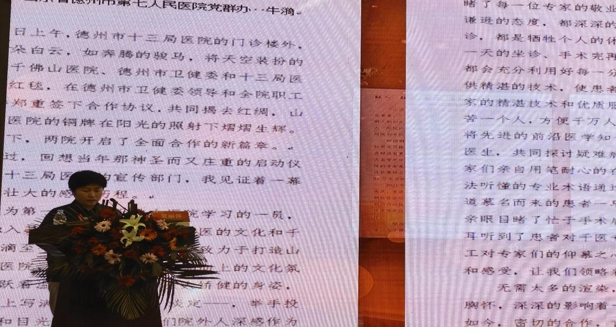 德州市第七人民医院自2016年10月和山一大一附院(省千佛山医院)全面合作以来,省千佛山医院先后派出心内科、神经内科、脊柱外科、呼吸与重症科、妇产科5个专业的专家团队,来院坐诊、教学、手术、查房及指导工作,共计服务州城患者3600余人次;2017年,德州市第七人民医院中层以上干部队伍60余人赴千医免费进修学习,深受千医人务实、严谨、人文理念的熏陶;2021年为德州市第七人民医院新任护士长团队,打造了精品专题护士长培训班。为助推德州市第七人民医院的全方位发展,做出了积极的贡献。此次表彰大会多项荣誉的获得,既是对德州市第七人民医院在千医医联体建设工作中成绩的肯定,也充分展示了德州市第七人民医院精湛的业务技术、丰富的职工文化生活和良好的精神风貌。