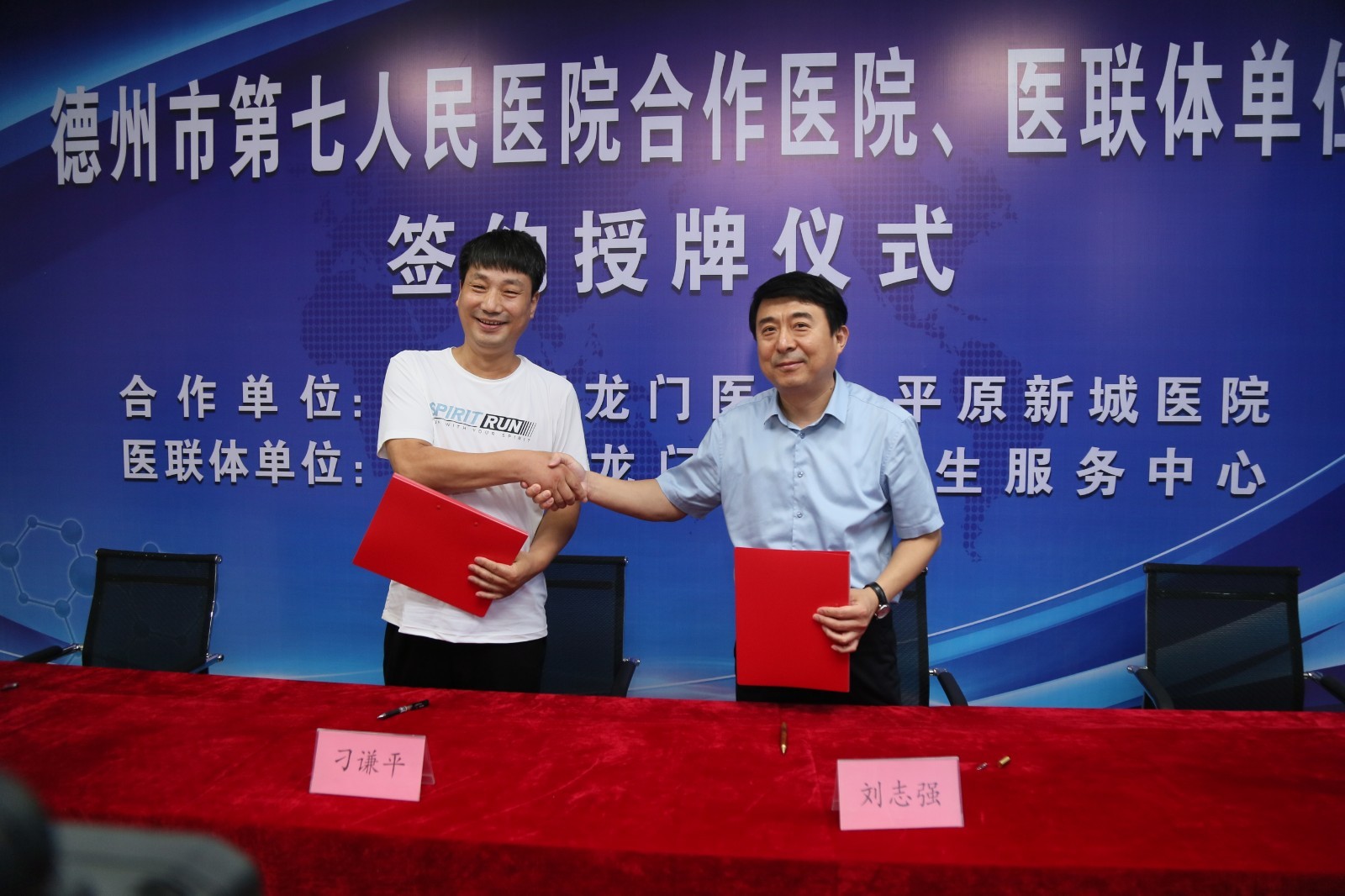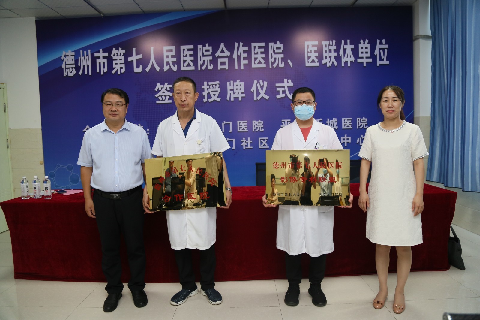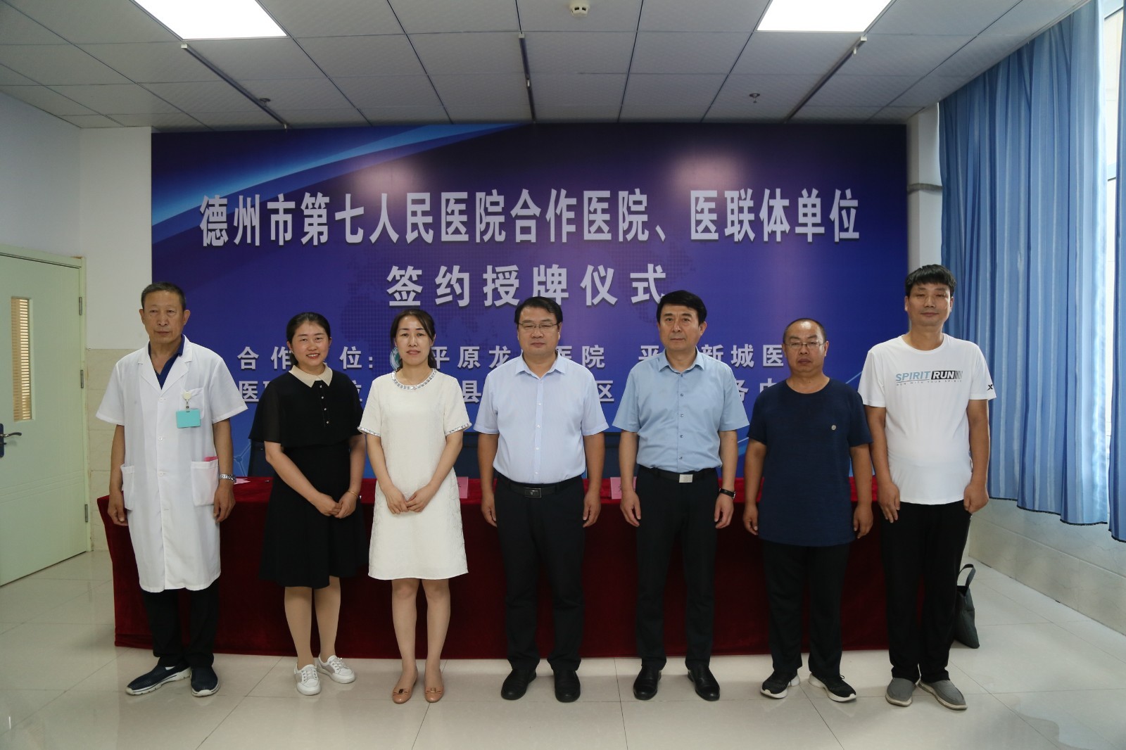 德州市第七人民医院党委书记翟学军与平原县卫健局副局长李玮为平原龙门医院授牌。平原龙门医院被授予“德州市第七人民医院合作医院”“德州市第七人民医院影像专科联盟”。