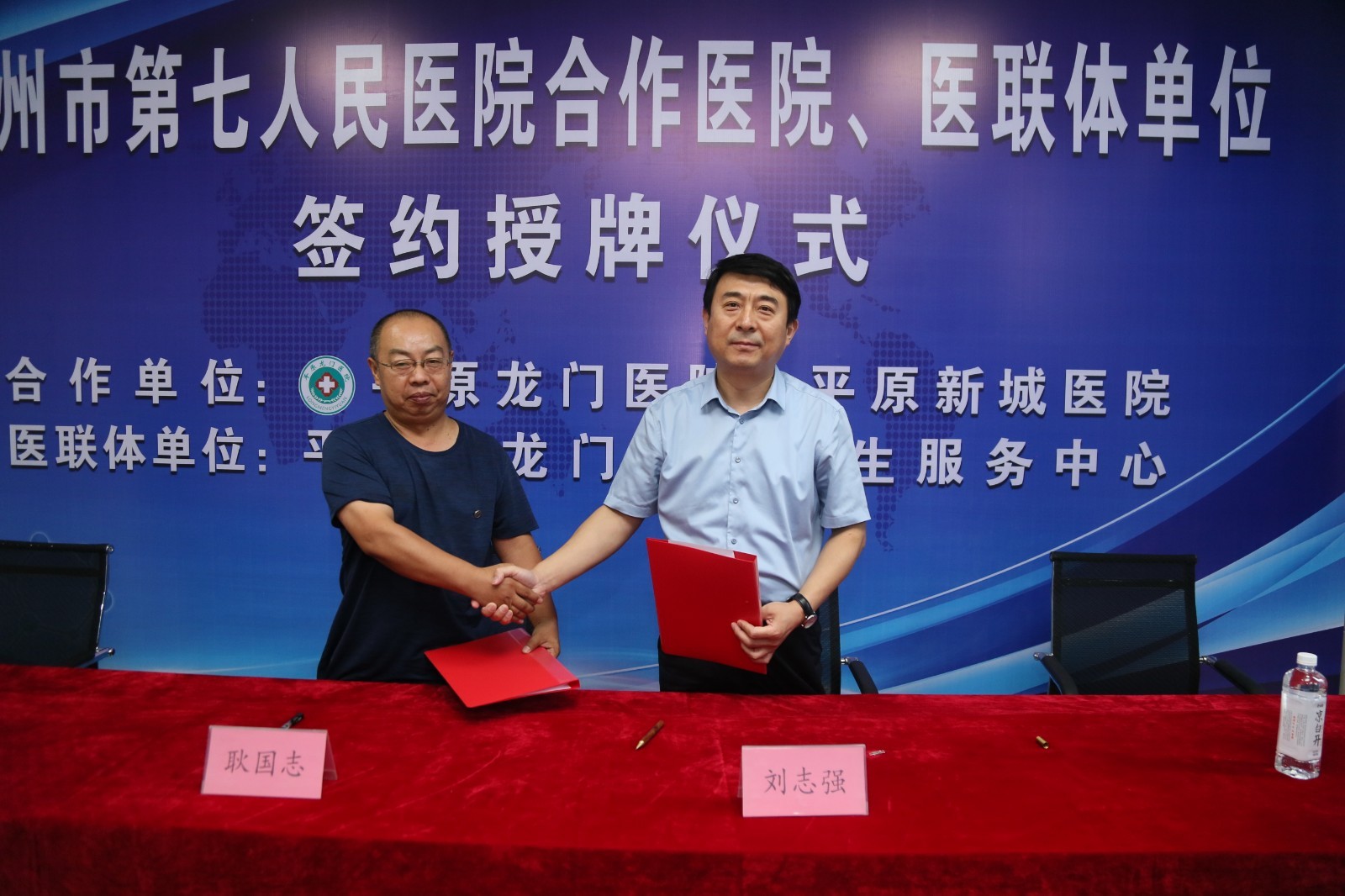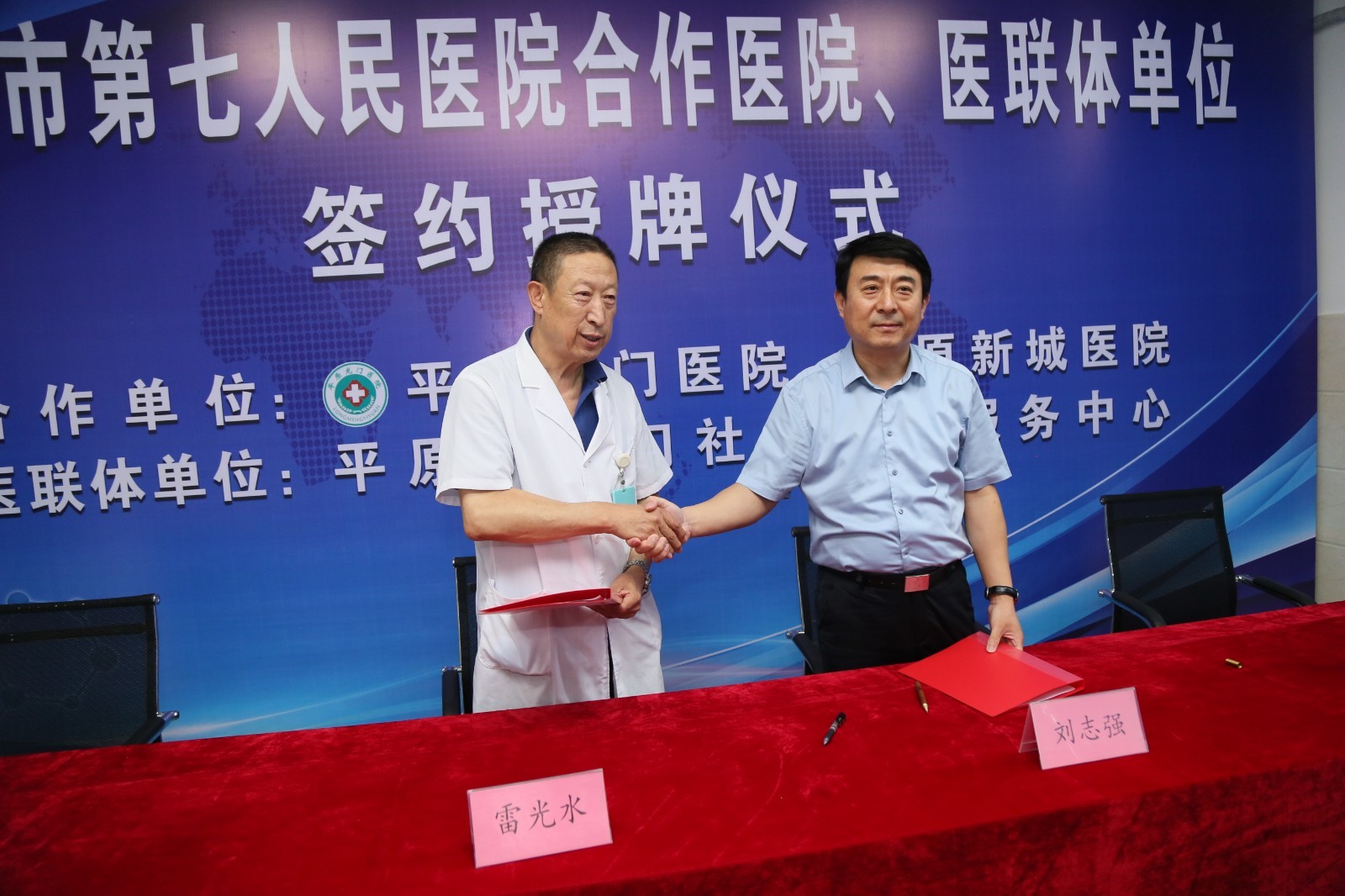 德州市第七人民医院副院长刘志强分别与平原龙门医院、平原新城医院、平原龙门社区卫生服务中心签约。