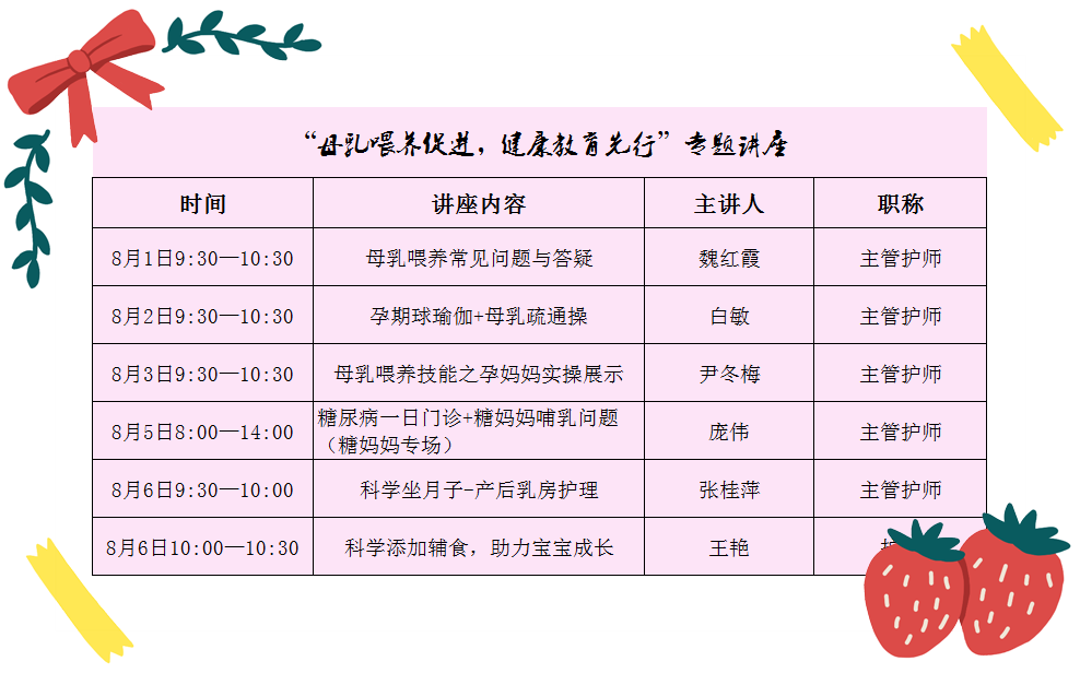 自8月1日开始,在孕妇学校开展“母乳喂养促进,健康教育先行”专题系列讲座。孕妇学校专职人员与产科病区护士长根据产妇经常遇到的哺乳问题,为大家进行针对性的知识讲解与技能指导,还有产后保健科、妇产康复中心的负责人为大家讲解产后乳房护理及宝宝辅食添加。讲座安排如下,您可以任意选择: