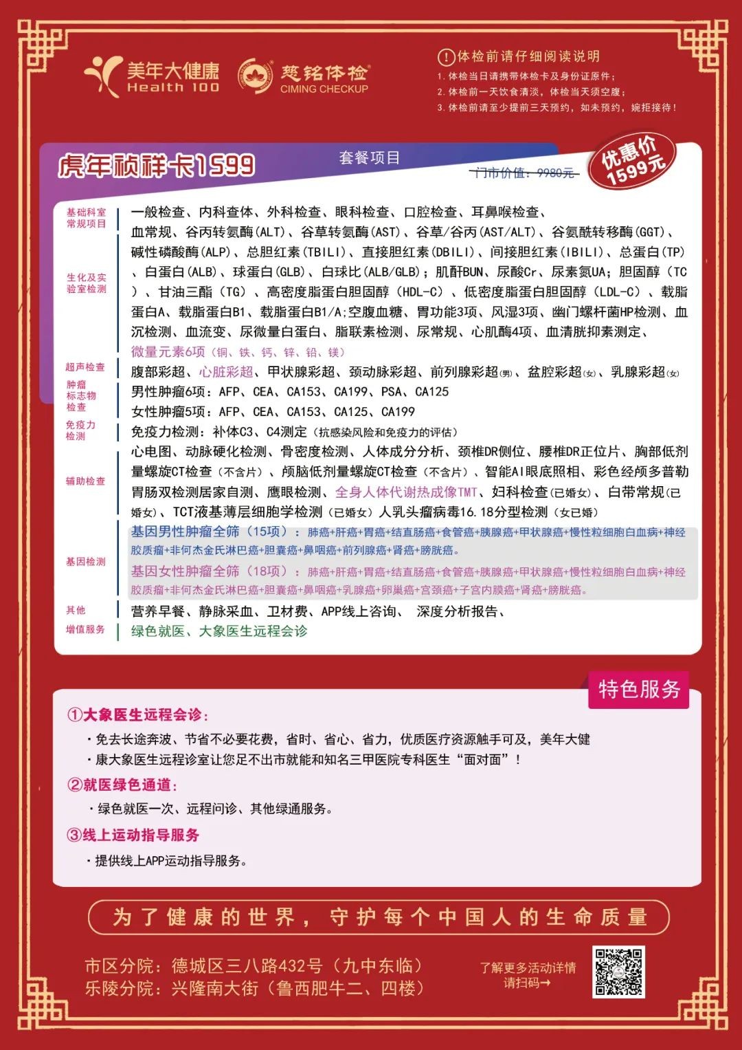 为进一步促进全民健康,做到疾病的早期预防。德州美年大健康体检,将于8月1日-9月30日推出祯祥卡三人同行一人免单活动。