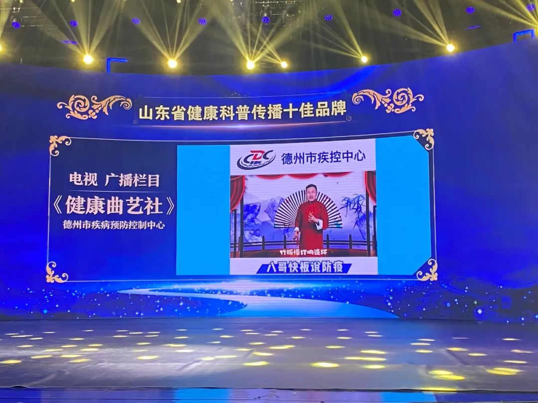 8月15日,山东省健康科普传播新媒体作品大赛及健康科普传播十佳品牌征集评选活动颁奖仪式在山东广播电视台举行。德州市疾控中心主办的健康科普栏目《健康曲艺社》荣获全省健康科普传播十佳品牌,在音频、视频、图文等单项健康科普作品评选中,斩获一等奖1项,三等奖2项,优秀奖2项。