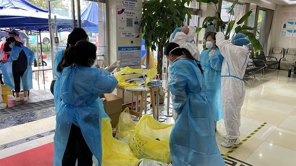 在核酸采样现场,美年医护们冒雨并“全副武装”,扫码、手消、拆棉签、采集咽拭子、装管、封管……连续高强度工作,密闭的防护服下,汗水湿透了衣服,防护面具、口罩在脸上留下了深深的勒痕,手指被橡胶手套里的汗水浸得发白发皱......但他们依旧严格按照操作流程工作着,他们一直坚持到最后,直到当天的核酸采样工作圆满完成,才敢喘一口气,停下来歇一歇。