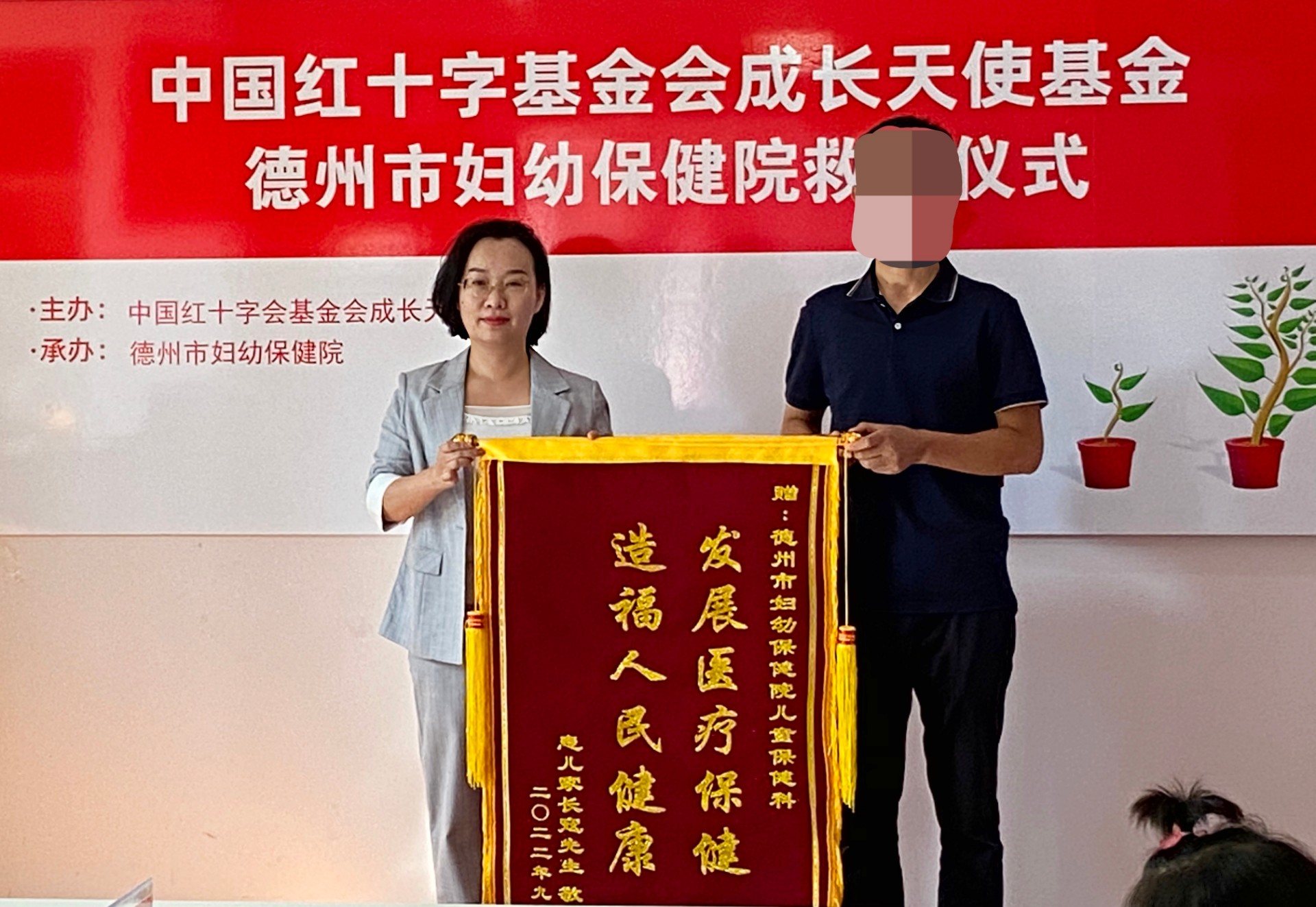 捐赠现场,受助家长送上锦旗,感谢天使基金及德州市妇幼保健院的帮助。此次捐赠可以让患儿获得半年的免费治疗机会,减轻家庭经济负担的同时,也让家长们看到了患儿得到治疗的希望。