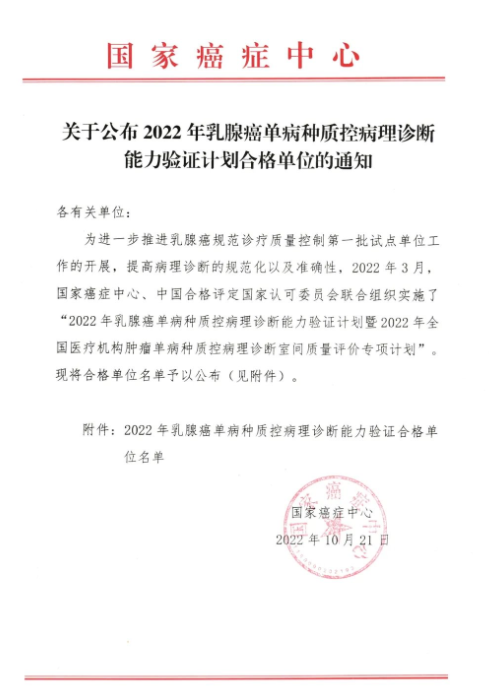 据悉,2022年3月,国家癌症中心、中国合格评定国家认可委员会,联合组织实施了“2022年乳腺癌单病种质控病理诊断能力验证计划暨2022年全国医疗机构肿瘤单病种质控病理诊断室间质量评价专项计划”。该项目评价内容包括乳腺癌病理切片的常规病理诊断及与乳腺癌治疗相关的免疫组化标记ER、PR、HER2、Ki67的判读。