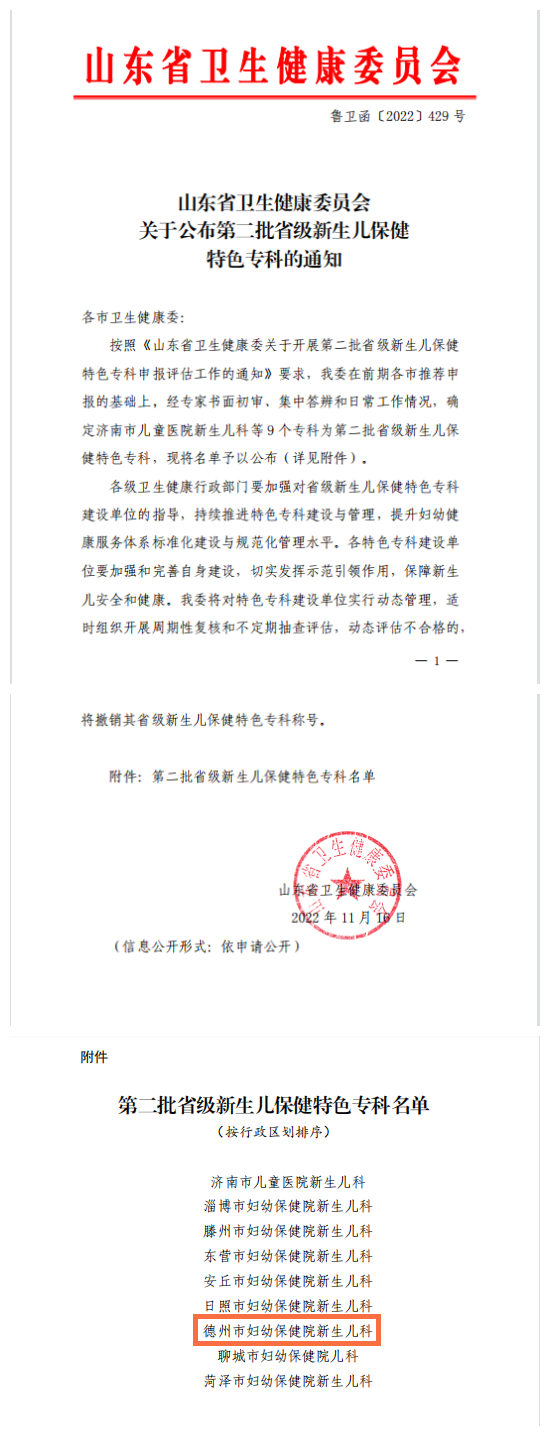 经过材料申报、初步审查、专家评审、现场答辩等环节的激烈角逐,德州市妇幼保健院在全省多家申报机构中脱颖而出,新生儿保健特色专科成为第二批省级新生儿保健特色专科。