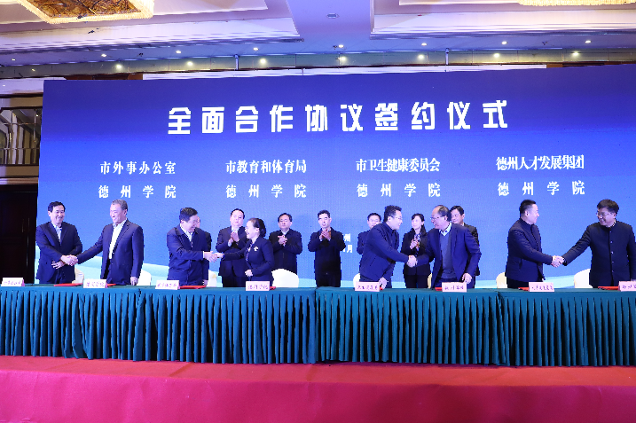 活动上,德州市市委常委、组织部部长马广峰,德州学院校长赵胜村为德州博士俱乐部揭牌,德州市副市长董绍辉与德州学院校长赵胜村签署《德州市人民政府 德州学院城校融合发展合作框架协议》;副市长李佳芮与德州学院副校长迟沂军签署《德州市人民政府 德州学院产教合作协议》;德州市教体局、德州市卫健委、德州市外事办、德州人才发展集团分别与德州学院签署合作协议。