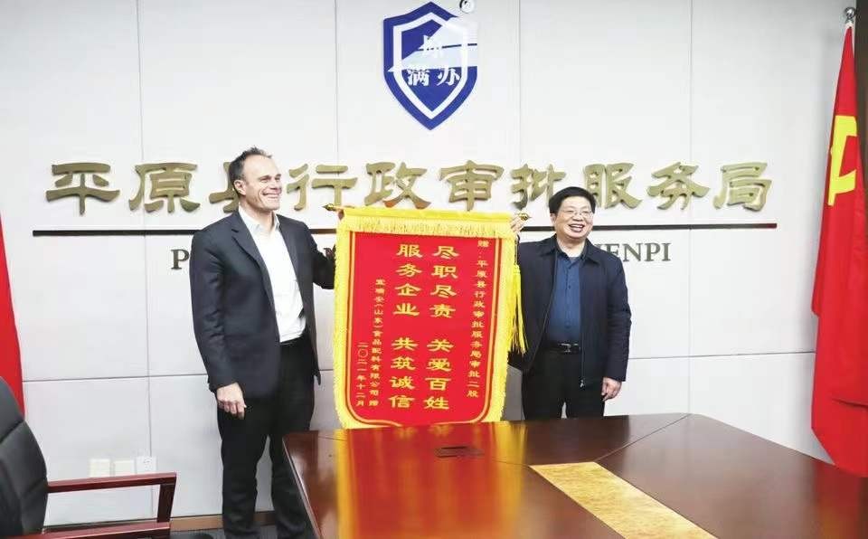 上月16日,宜瑞安亚太区副总裁、中国区总裁雅克·古励专程从上海来到平原县,将两面锦旗送给平原县行政审批服务局相关科室负责人,感谢他们优质高效的服务。“这是公司全球首次送锦旗。”平原宜瑞安五星项目负责人宋忠波介绍。