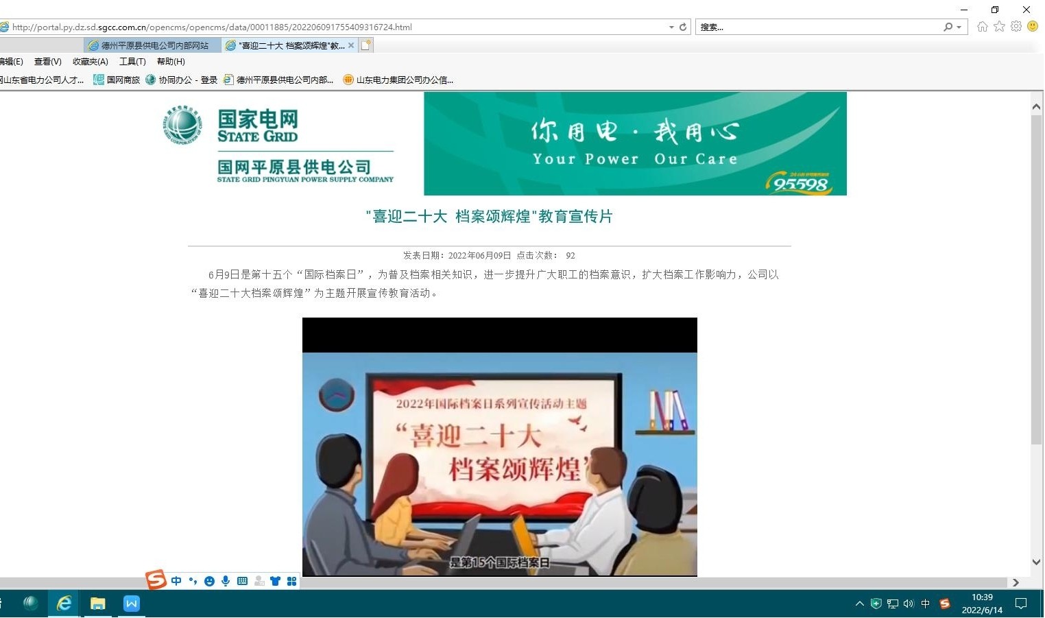 当天还在公司内部网站同步开展《喜迎二十大 档案颂辉煌》宣传工作——通过《中华人民共和国档案法》讲述了什么是档案,传播了人人都是档案员的观点,让广大员工树立档案意识。明确提出公民有保护档案的义务,也享有依法利用档案的权利;档案违法行为应承担相应法律责任。“为党管档、为国守史、为民服务”是档案工作的神圣职责,也是档案工作姓党的政治属性所在。