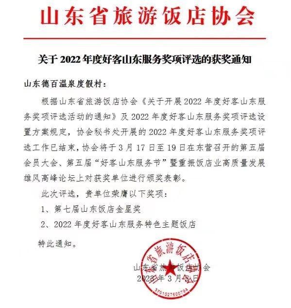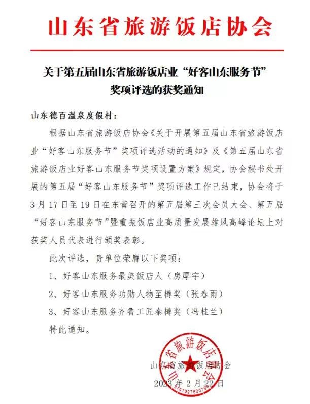 近日,2022年度好客山东服务奖项获奖名单出炉,夏津德百温度假村榜上有名,荣获“第七届山东饭店金星奖”和“2022 年度好客山东服务特色主题饭店”双项称号。夏津德百温度假村张春雨荣获“好客山东服务功勋人物至樽奖” ;房厚宇荣获“好客山东服务最美饭店人”;冯桂兰荣获“好客山东服务齐鲁工匠泰樽奖”。