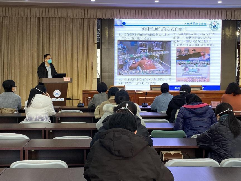 培训中,感染性疾病科副主任任勇从“俯卧位通气”原理、操作规范、体位摆放、注意事项等方面进行详细讲解,让大家直观掌握“俯卧位通气”方法。