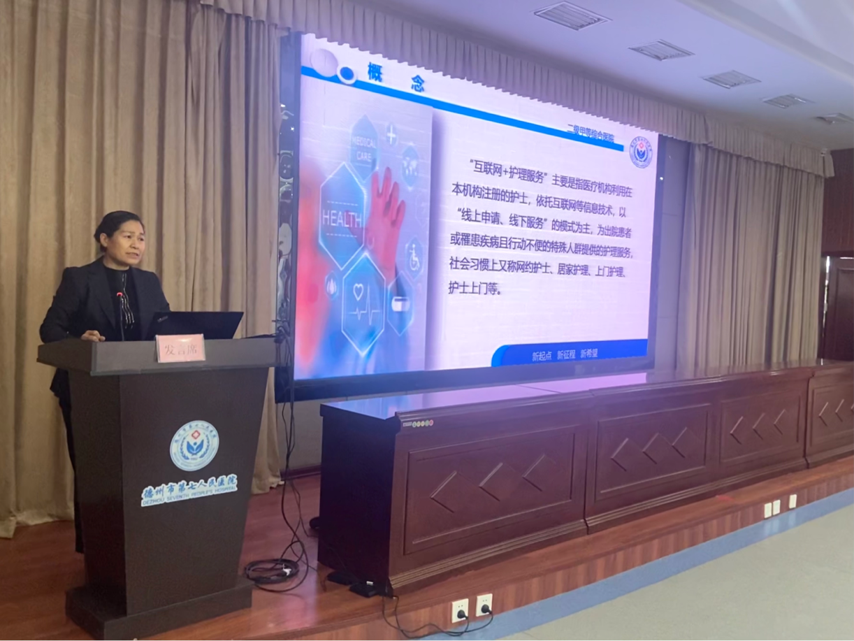 王炳花代表医院做“深耕“互联网+护理服务”模式,打通最后一公里”国家智能社会治理特色基地场景建设推进工作汇报。通过PPT的形式从项目开展背景、现状、效果以及痛点分析,四个方面展示了项目取得的成效,形成了系列“网约护理”的制度、流程、预案,解决了众多慢病居家患者的就医痛点,展示了德州市第七人民医院有温度的“网约护士”宣传片。