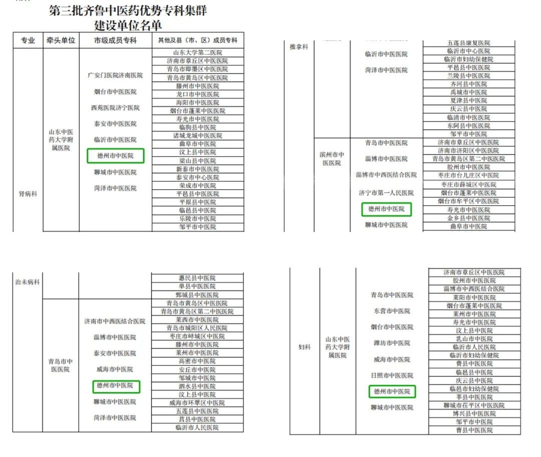 近日,省卫生健康委公布第三批齐鲁中医药优势专科集群建设单位名单,德州市中医院肾病科、治未病科、推拿科、妇科四个科室成功入选集群建设项目,成为市级成员专科。这是德州市中医院继康复科、骨伤科、脾胃病科、儿科成功入选后的又一新的突破。截至目前,德州市中医院已有8个专业科室进入齐鲁中医药优势专科集群建设项目,集群成员科室会以此为契机,进一步推进特色建设,明晰建设目标,提升中医药服务能力,助力医院高质量发展,更好地护佑百姓健康。(刘珊珊)