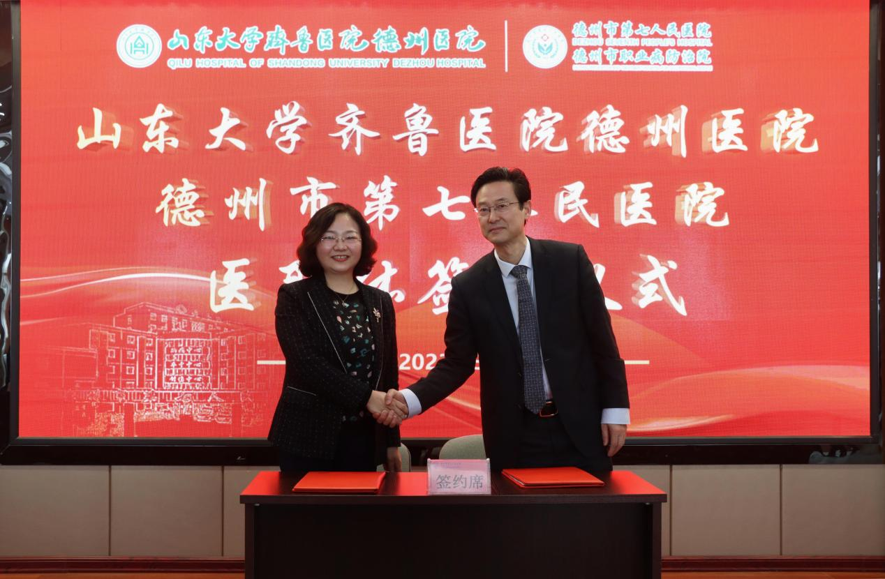 山东大学齐鲁医院德州医院党委委员、执行院长王东海与德州市第七人民医院党委副书记、院长庄霞签署医联体合作协议