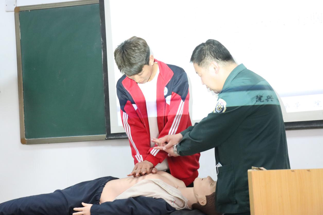 急诊科主任郭玉彬通过理论教学和实践操作相结合的方式,利用人体道具模型对心肺复苏术进行现场示教,并指导同学亲自上手操作,规范其心肺复苏的操作方法及急救流程,传播救护知识与理念,增强同学们应对危险的自救互救能力。