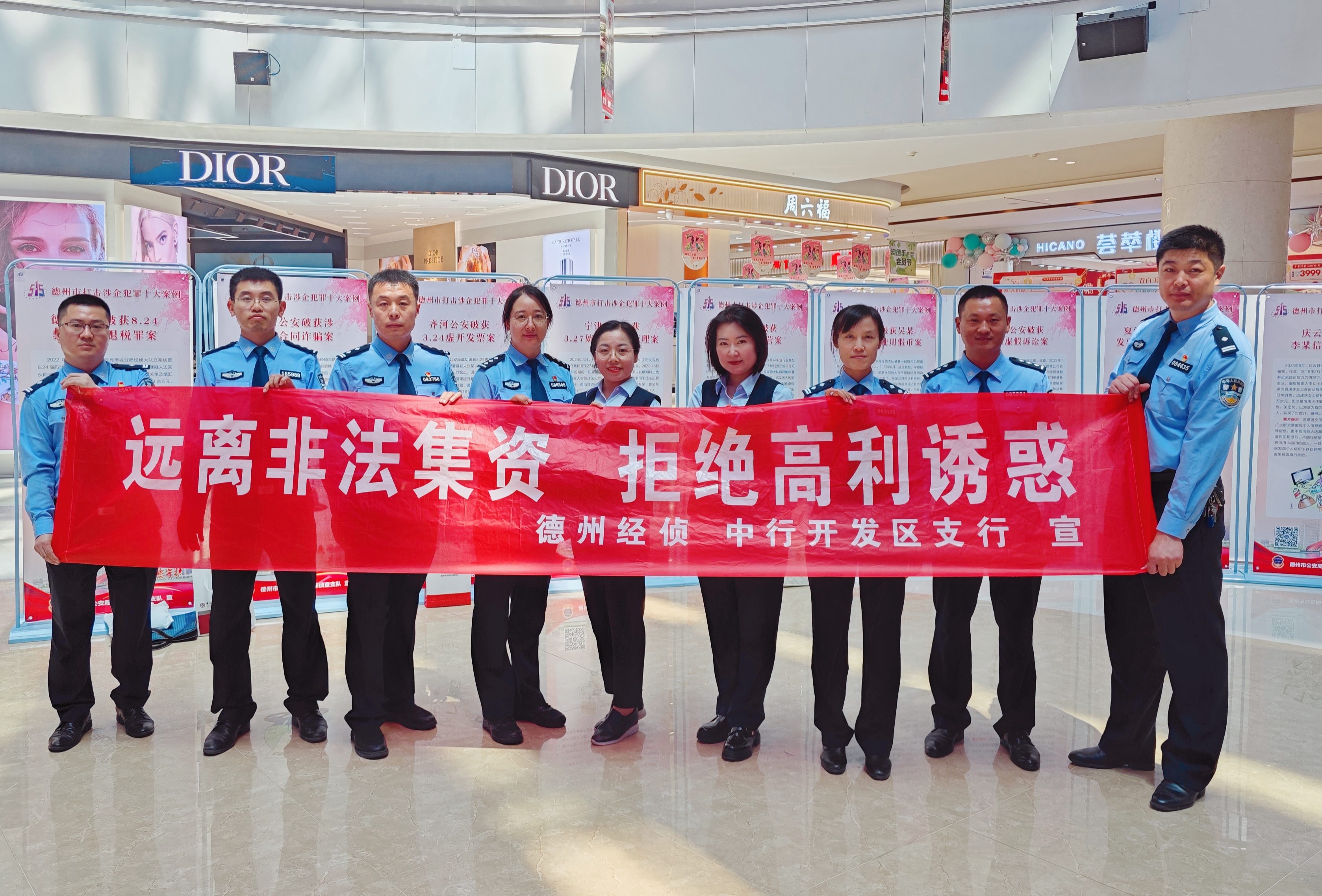 打击和防范经济犯罪与每个公民的切身利益息息相关。在第十五个全国“5.15”打击和防范经济犯罪宣传日到来之际,为进一步提升广大人民群众识别防范经济犯罪的能力水平,突出公安经侦及银行业防范化解金融风险、服务优化营商环境、参与社会协同治理,5月15日上午,德州中行开发区支行联合德州公安局经侦支队赴澳德乐时代购物广场组织开展主题为“远离非法集资,拒绝高利诱惑”的防范经济犯罪宣传活动。