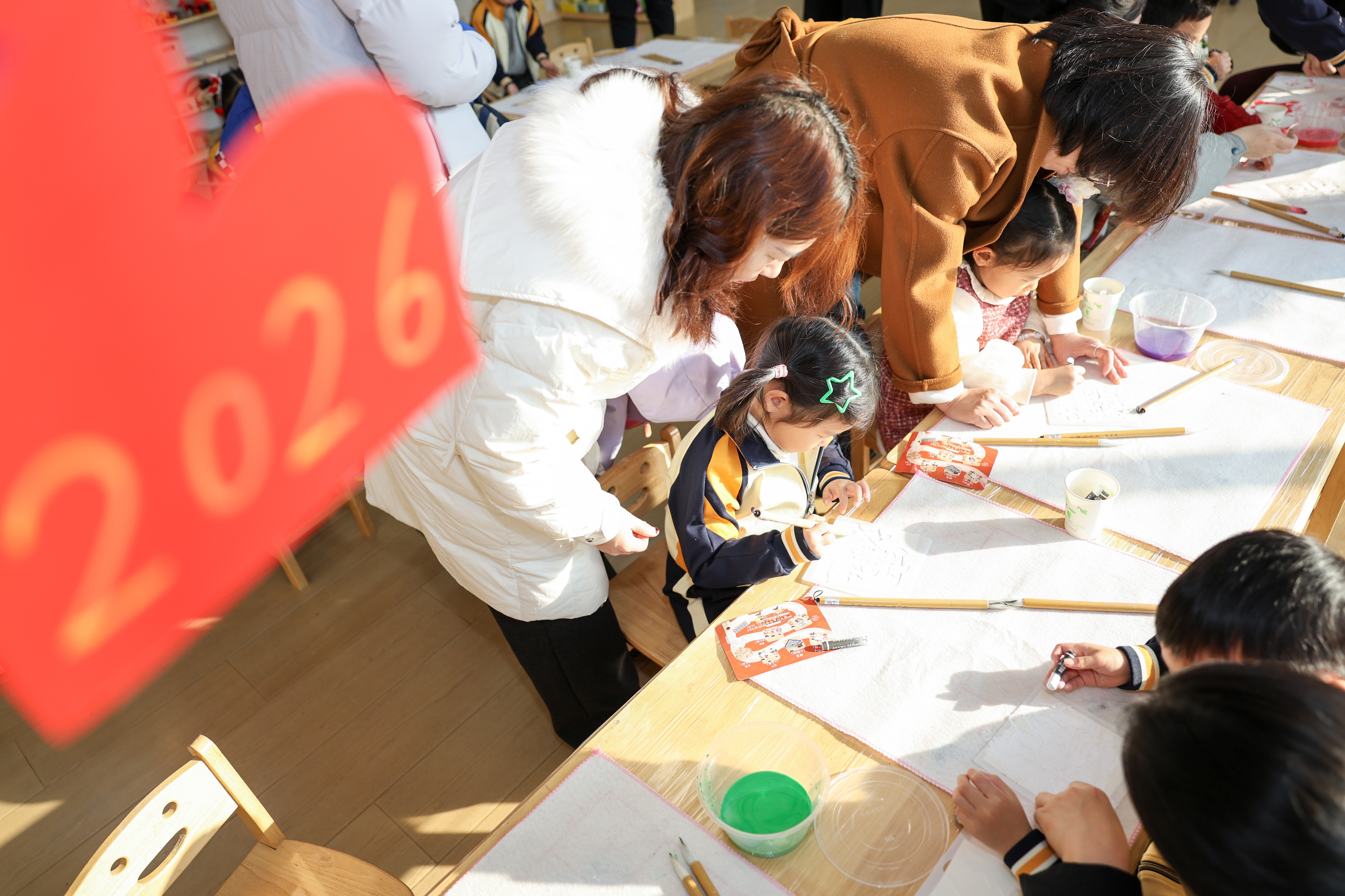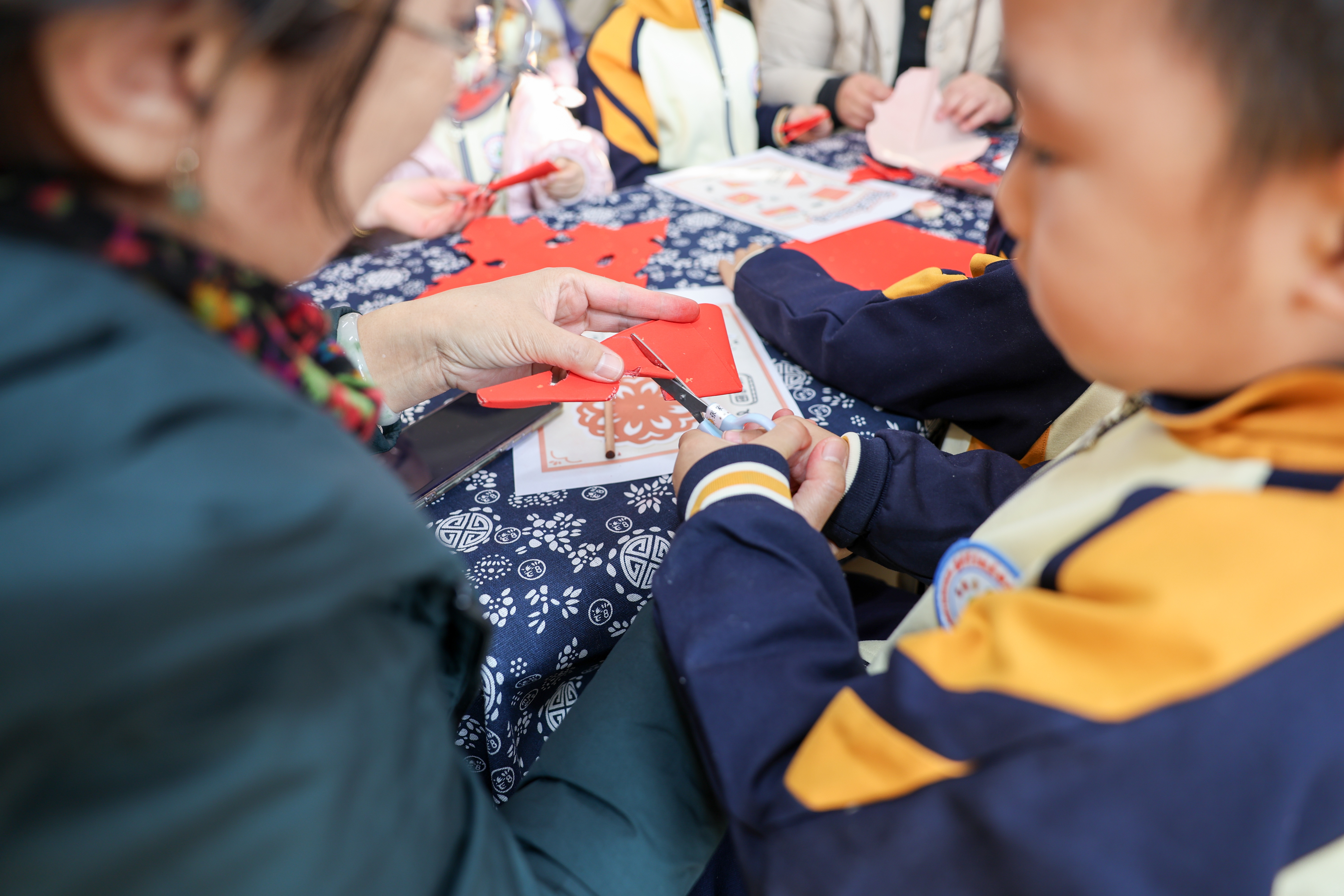 活动现场精彩纷呈,小剧场表演率先点燃氛围:情景剧《大运河的使命》生动再现运河文化风貌,打击乐《春节序曲》节奏明快,串烧《张灯辞旧岁・成语拜新年》将传统成语与灵动舞姿相结合,年味十足。表演结束后,亲子游园体验正式开启,幼儿园一楼公共区域与各班教室化身非遗体验乐园,剪纸、拓印等传统技艺摊位前人头攒动,孩子们在家长陪伴下,裁剪吉祥图案、拓印古朴纹样,亲身感受传统工艺的独特魅力。