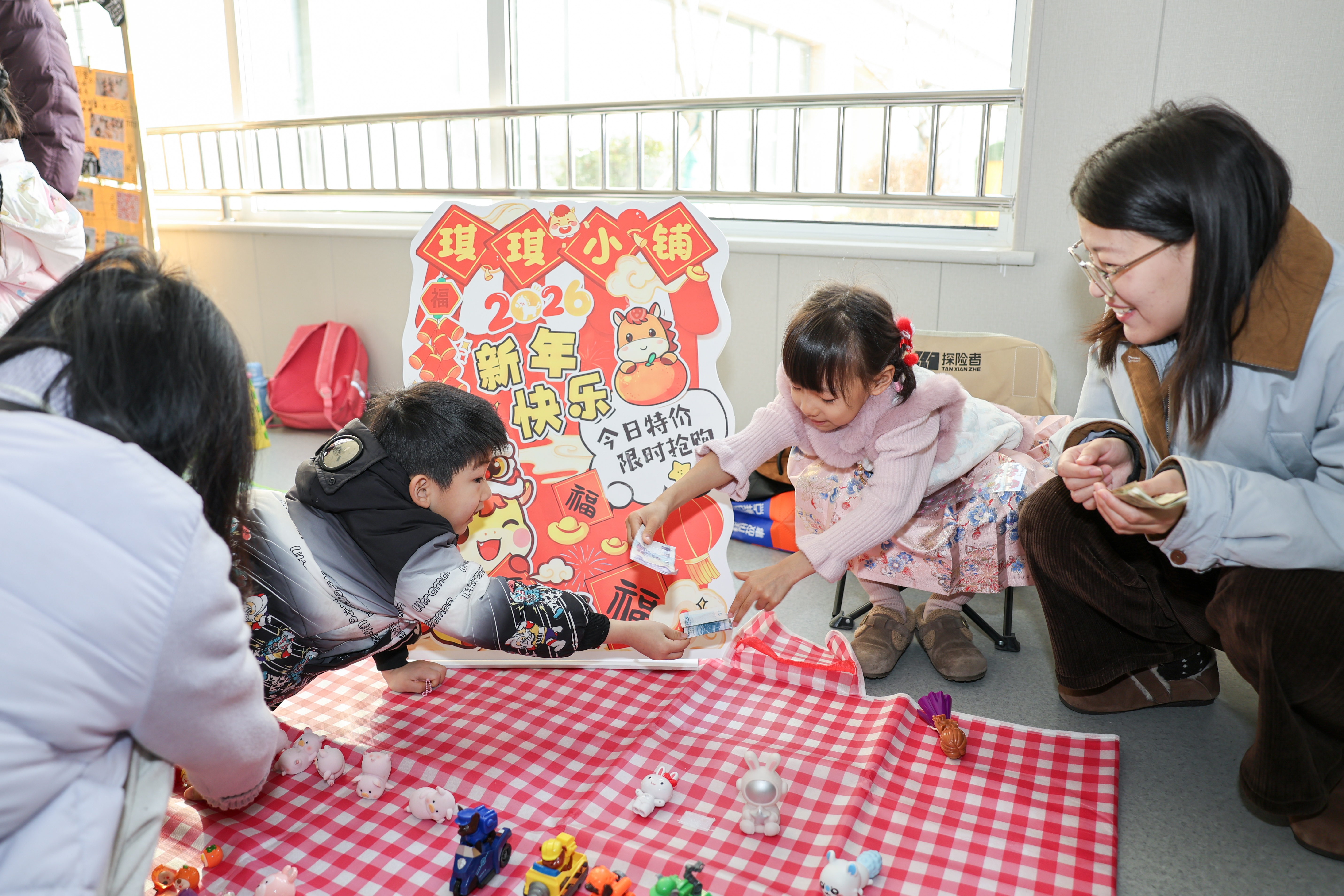 “运河集市”上热闹非凡,小摊主们热情推销闲置玩具与绘本,讨价还价声、欢声笑语此起彼伏;萌趣机甲灵动舞动,时而摆出可爱造型,时而与孩子们互动嬉戏,让大家直观感受科技乐趣;身着特色服饰的NPC财神爷穿梭其间,亲切互动并派送小礼品,为活动增添更多趣味。