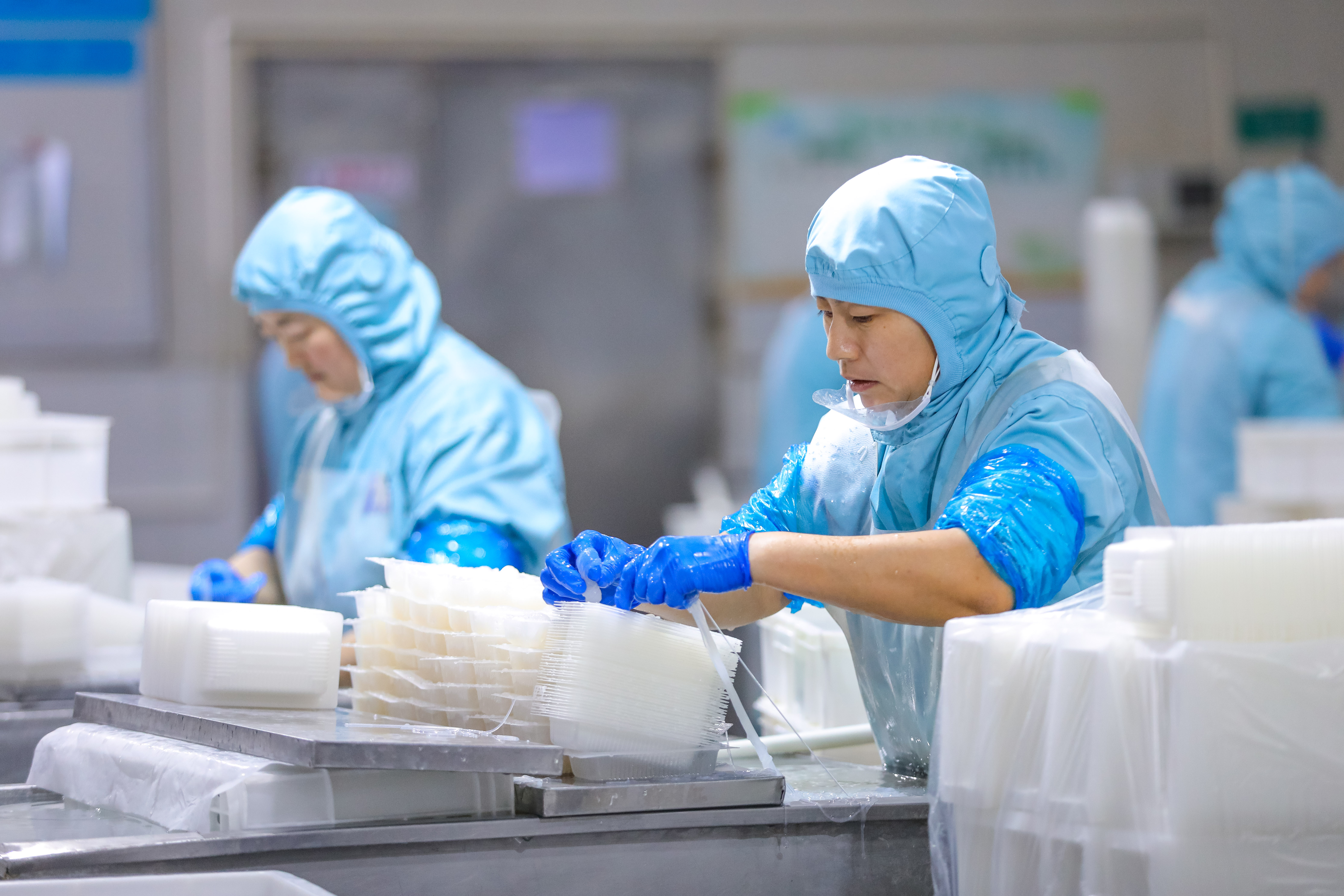 12月18日,在位于山东省乐陵市的山东民安食品股份有限公司,工人在分装生产线上忙碌。(张鹰 摄)