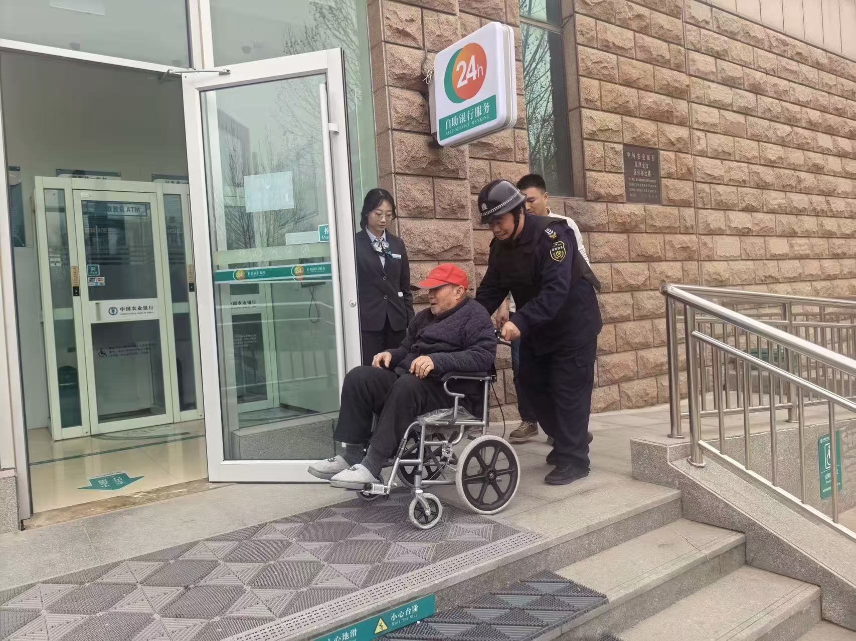 3月17日,微寒的春风中,90岁的李大爷坐着轮椅,在孙子的陪同下,来到农行夏津县支行办理社保卡激活业务。因老人腿脚不便、全程沉默,门口的台阶让祖孙俩犯了难。