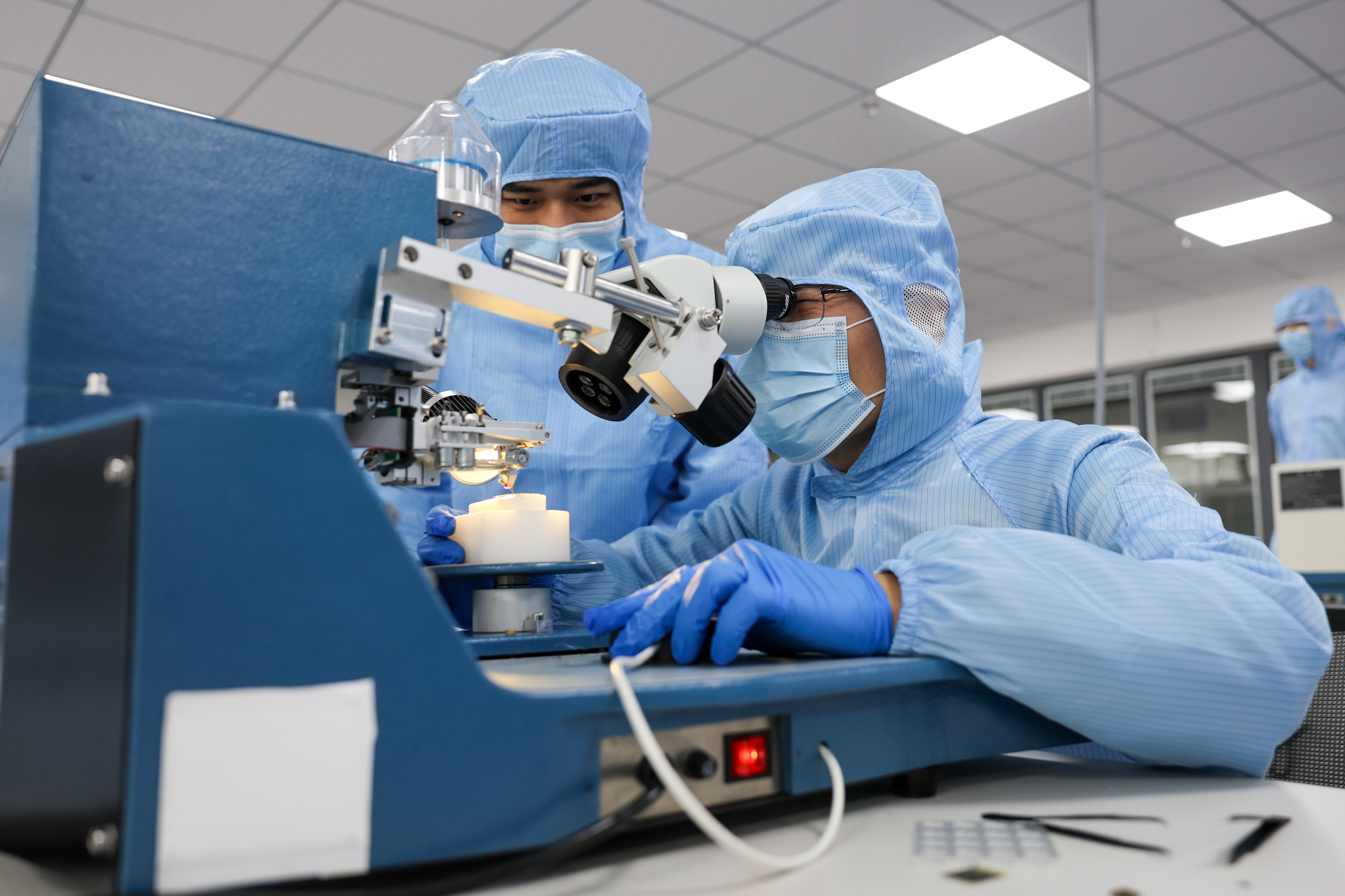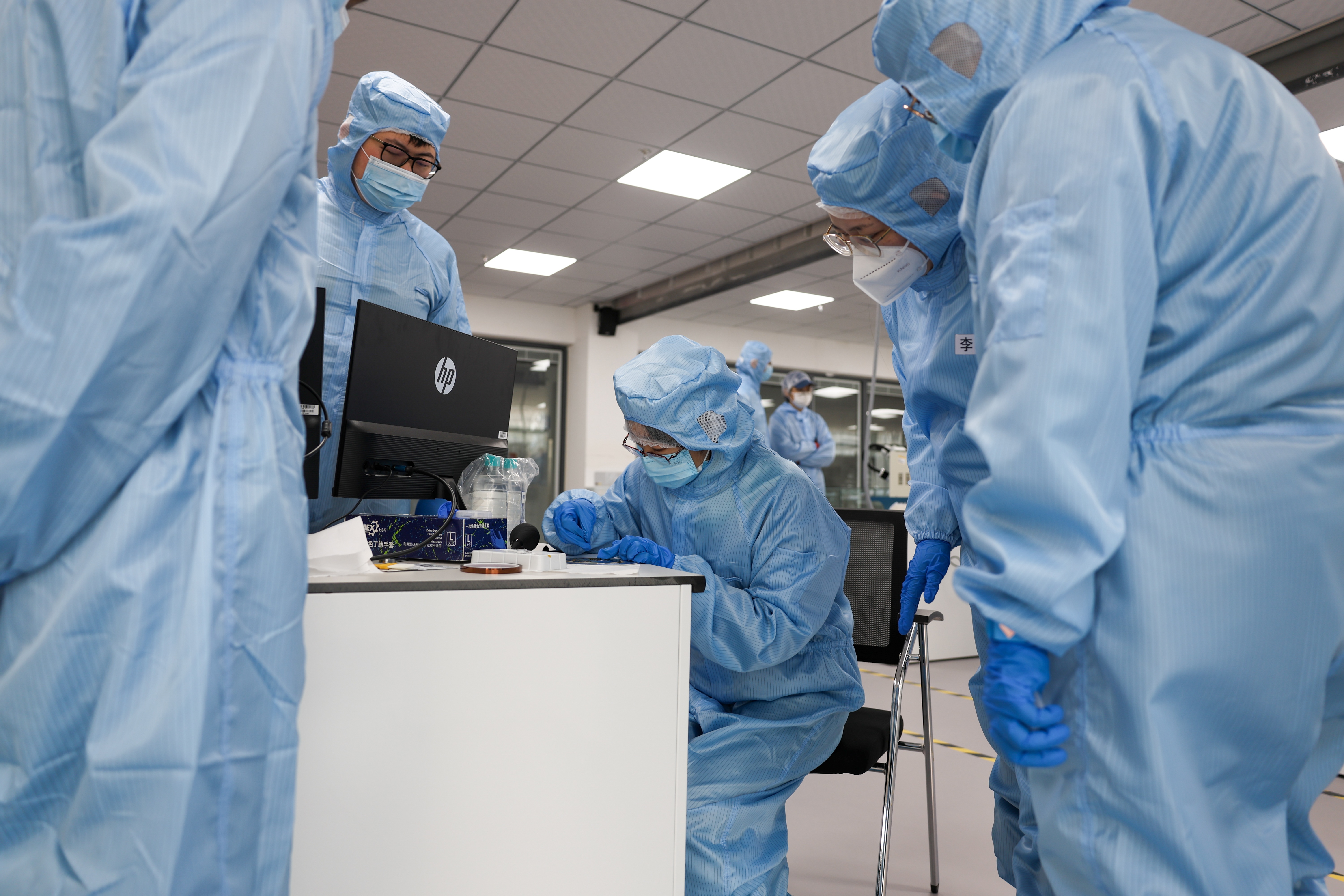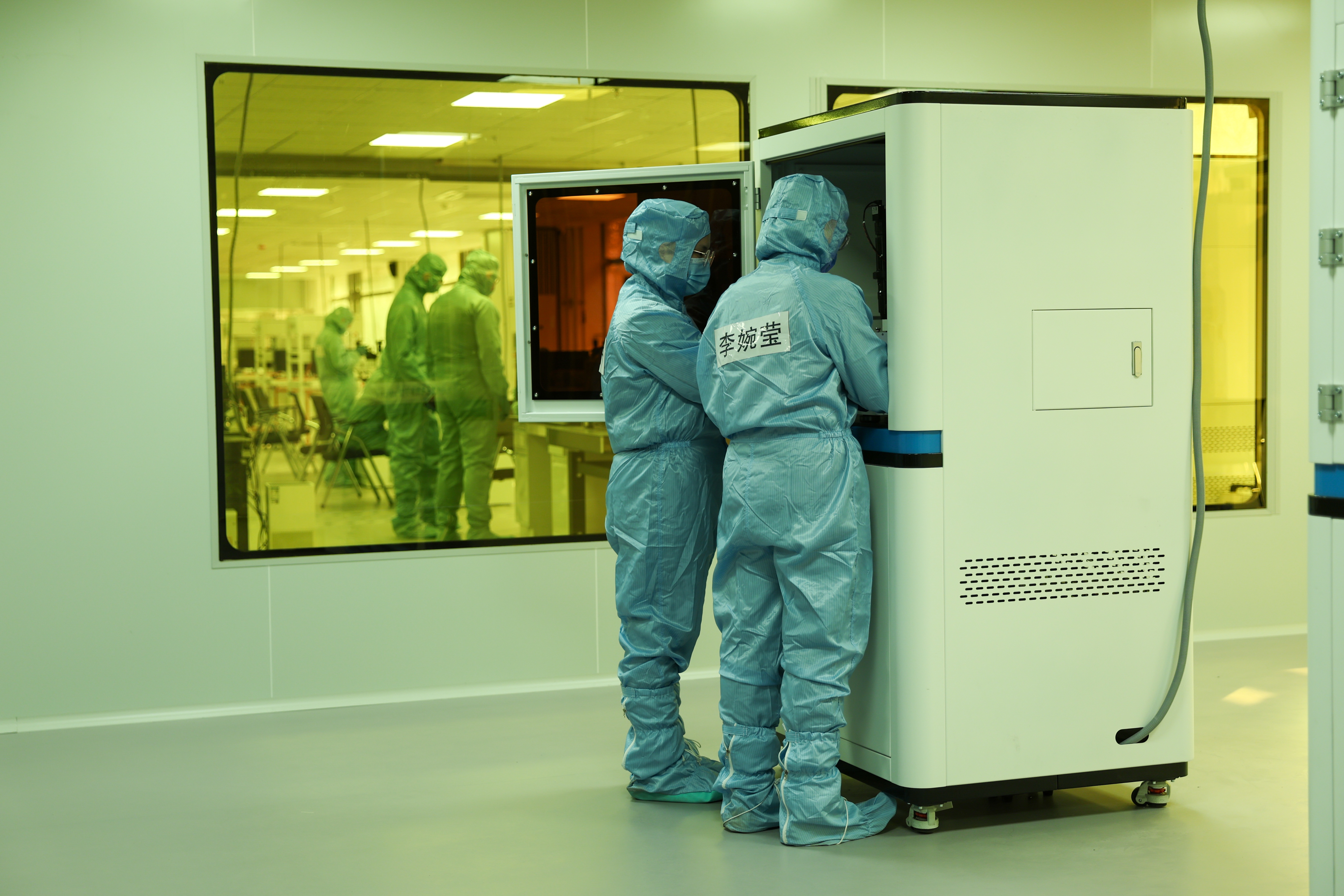 走进实践中心,映入眼帘的便是十几位身着蓝色无尘服的身影。他们就是学院的老师们,正分散在各台设备前,有条不紊地操作、交流,沉浸在实操学习的氛围中。