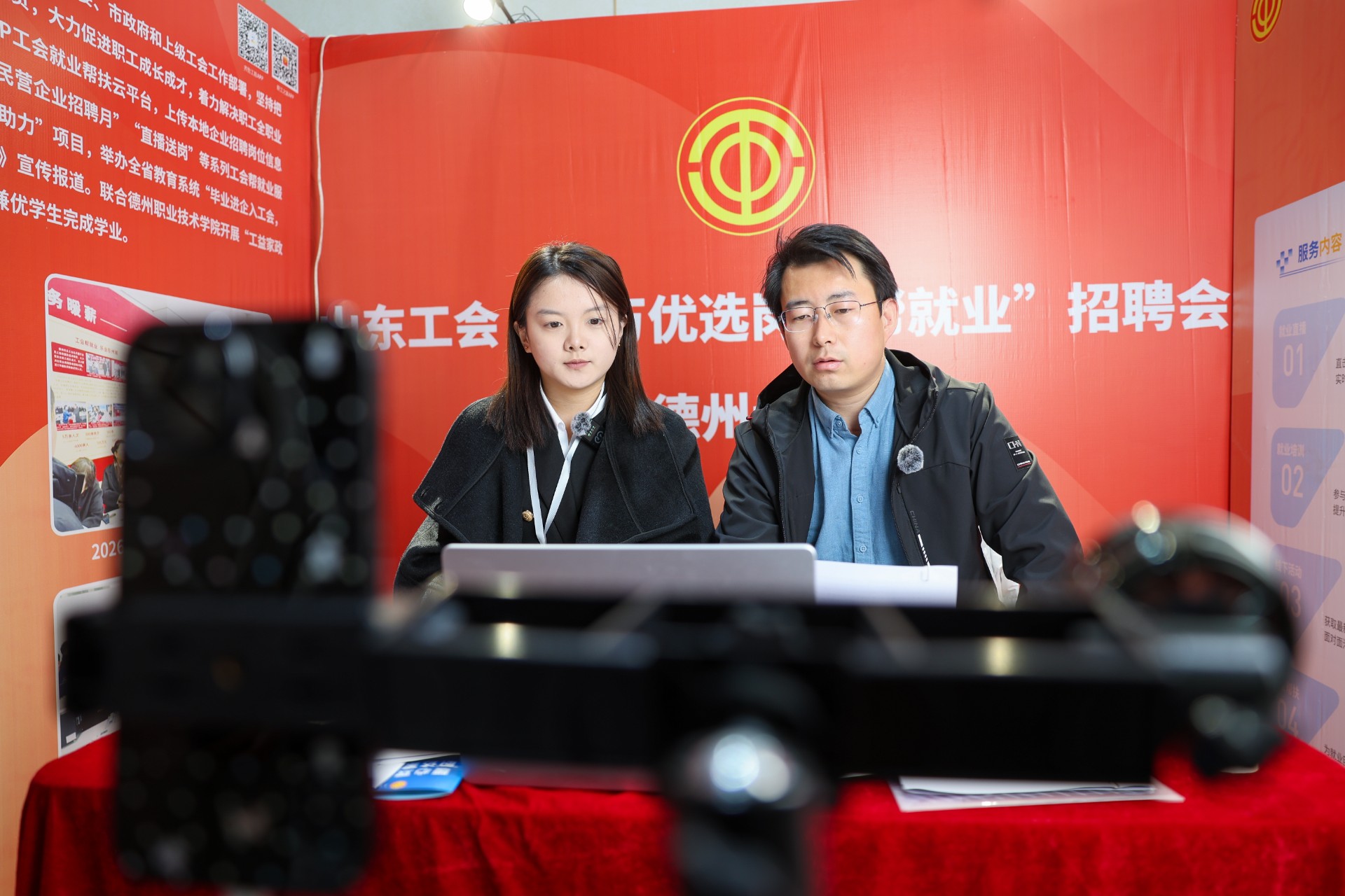 3月17日,2026年山东工会“十万优选岗位帮就业”进校园活动暨德州市第一届大学生直播电商大赛启动仪式在德州工程职业学院举行。活动现场邀请制造业、服务业、新业态等领域130余家企业设置招聘展位,计划招聘近1400人,吸引德州市5所高校1000余名应届毕业生现场求职。