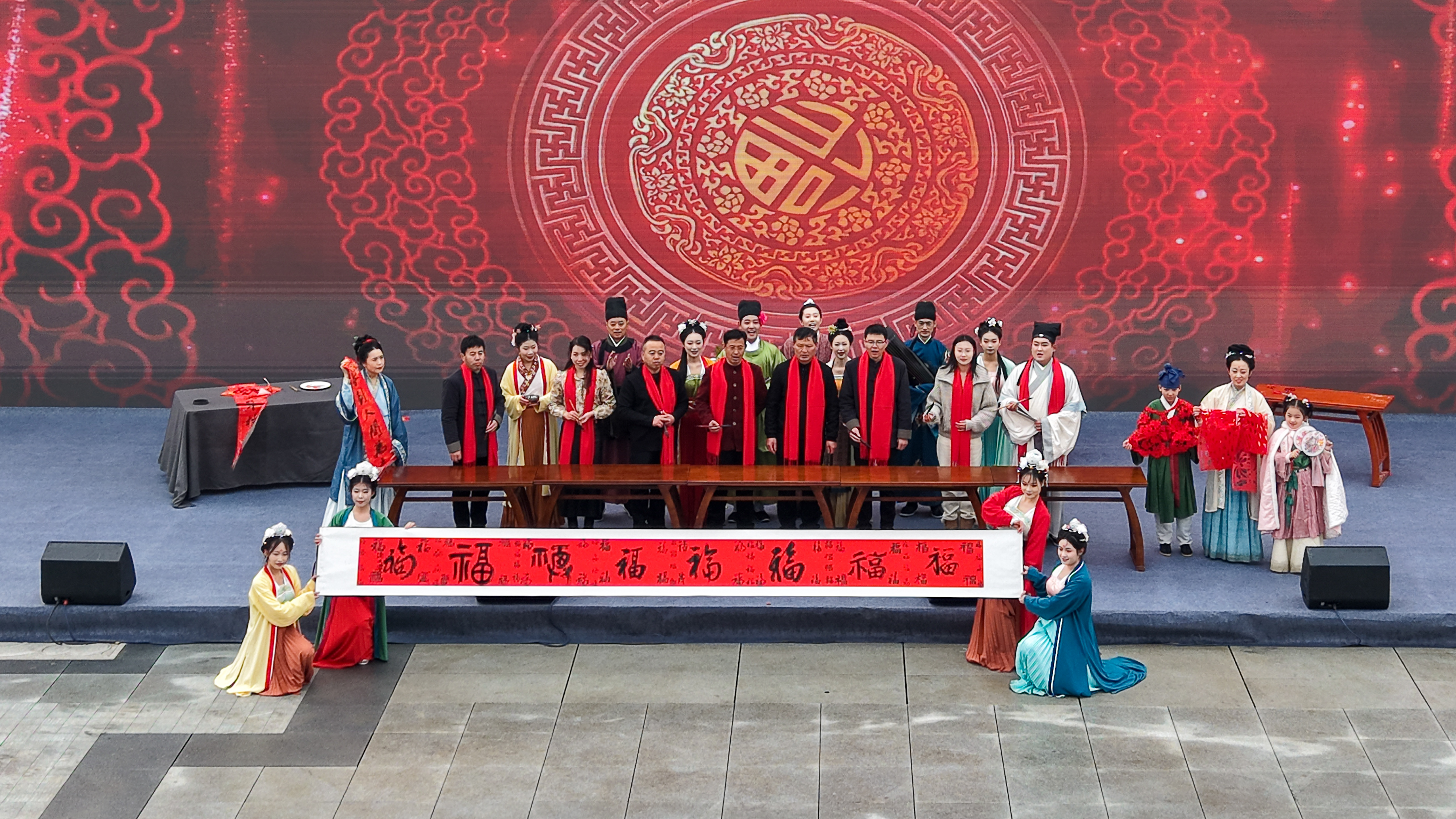 现场,音乐环绕,舞姿欢快,舞龙民俗艺术展演拉开帷幕。一场《宋潮雅集》情景表演将游客带入古韵悠长的氛围,演员衣袂飘飘,再现宋风雅趣。十余名书法爱好者凝神于铺开的长卷,挥毫泼墨,一个个“福”字渐次呈现。各类民俗接连上演,精湛的非遗技艺引来喝彩。