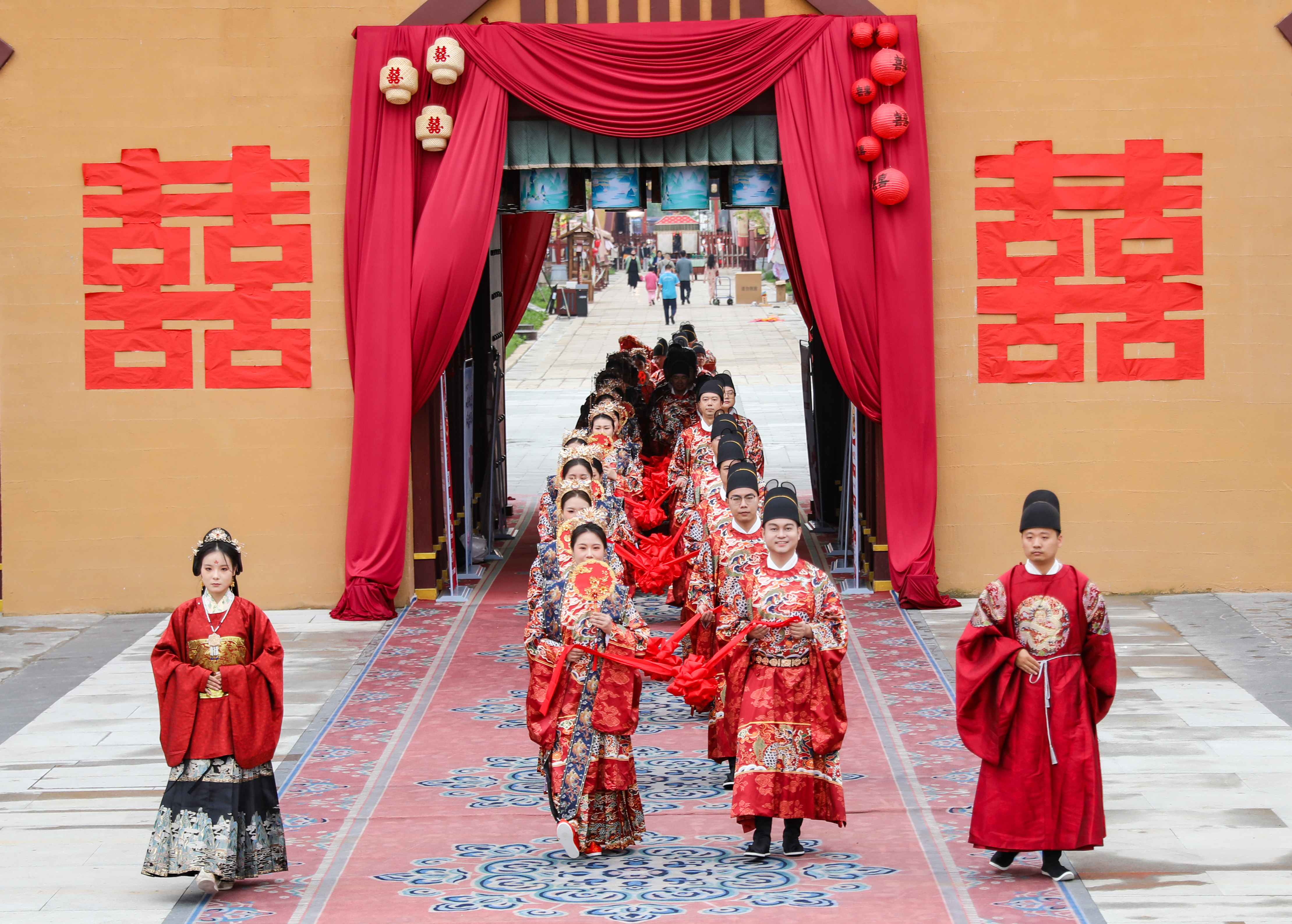 2025年9月27日上午,山东省乐陵市‘建’证幸福·情定枣乡青年集体婚礼活动在乐陵影视城举行,28对新人身着华美汉服,在传统婚俗