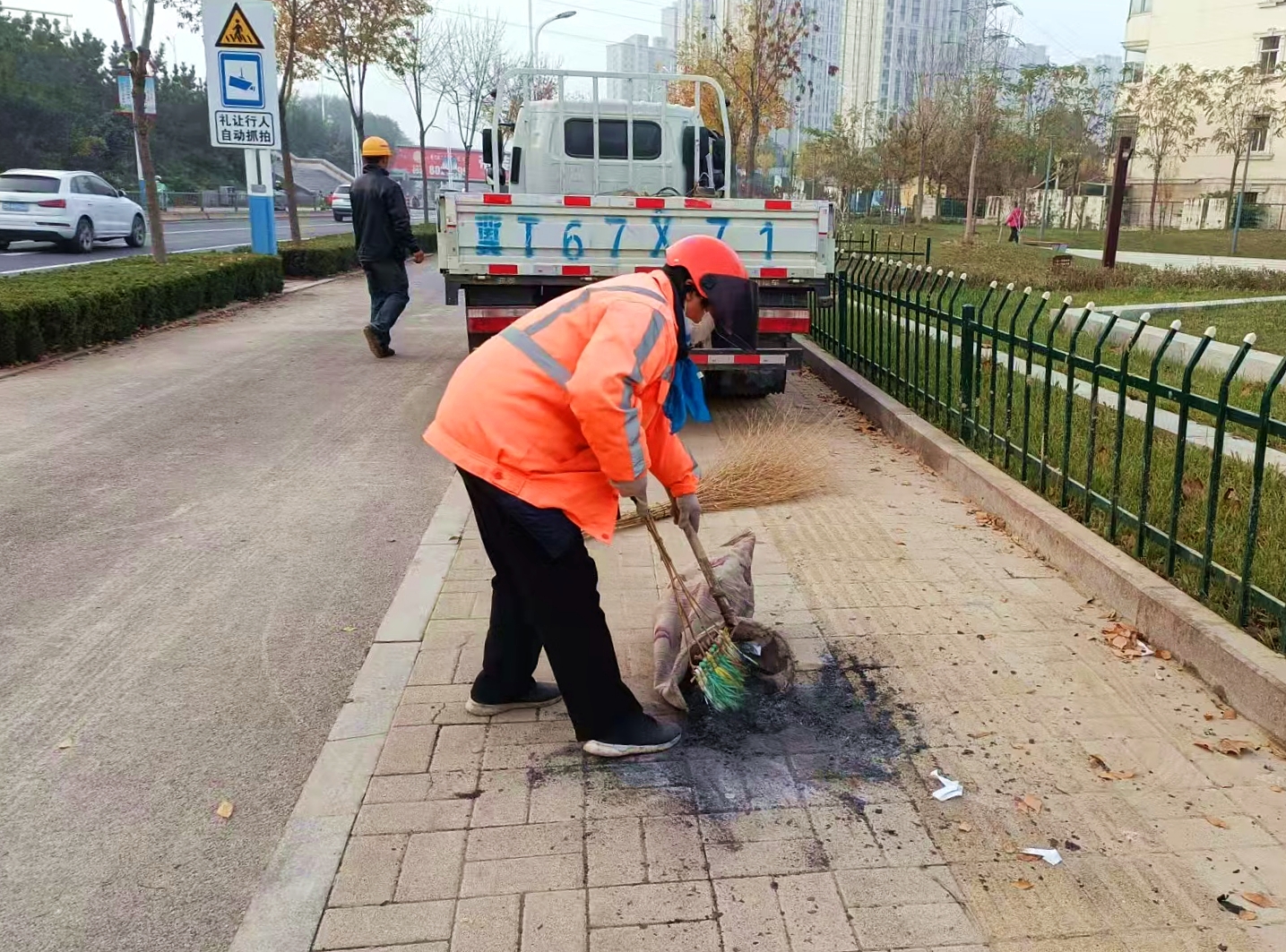 在清洁作业上,中心采用“人工+机械”协同作业模式,提升路面清理质效。保洁人员首先对祭祀残留灰烬进行细致清扫,确保无明显杂物遗留;随后出动专业污渍清除机,对路面焚烧痕迹进行深度冲洗,实现“清扫—冲洗—洁净”闭环处理,保障路面恢复整洁,不影响市民出行和城市整体美观。