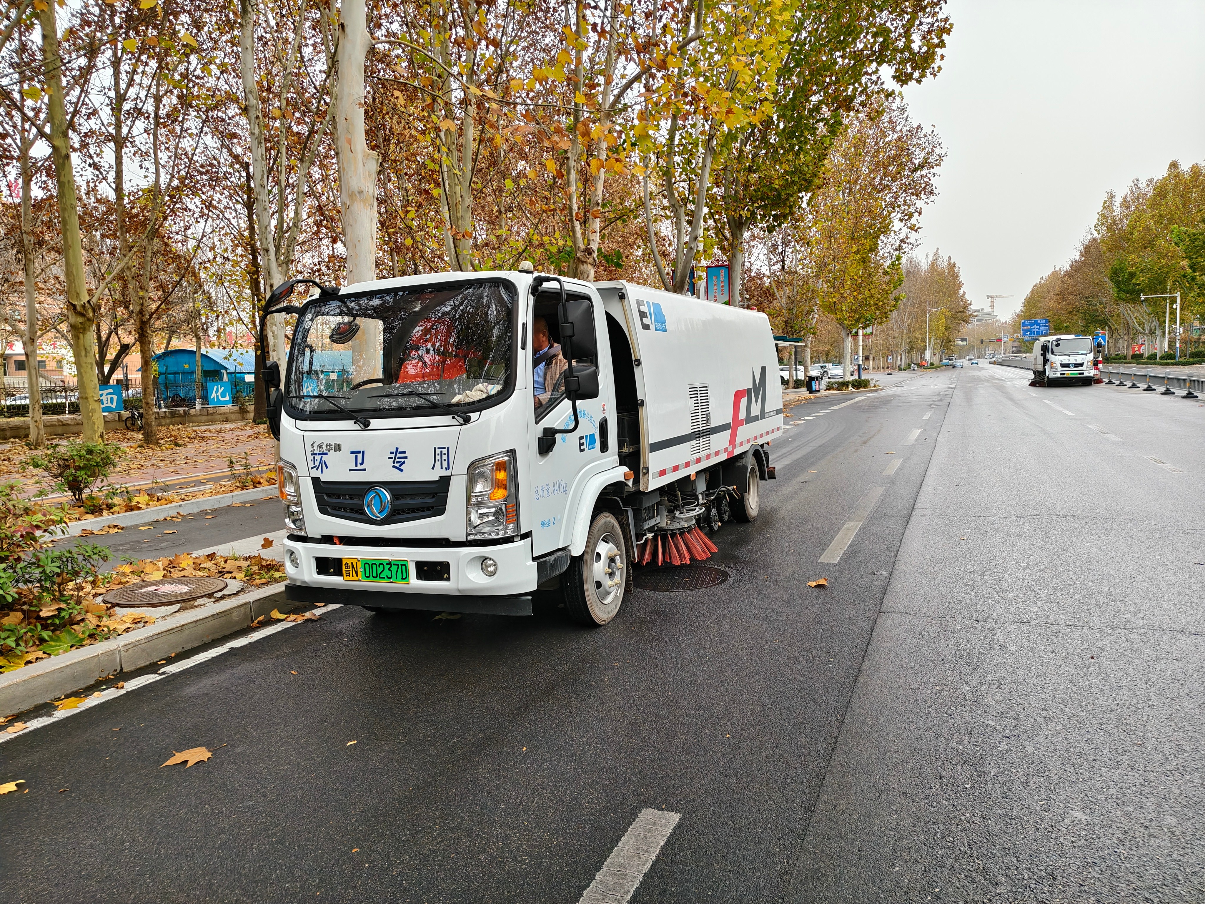 此次攻坚行动中,环卫中心延续“分片包干、责任到人”的核心机制,结合当日风力特点精准优化作业时序和策略,构建“横向到边、纵向到底”的全域清扫模式。针对晶华大道、东方红路、东风路、康博大道、长河大道、天衢路、大学路等重点路段,创新采用“机械早启+人工补位”的协同作业模式,40余部大型机扫车于清晨6点率先启动,以“扫吸结合”的作业方式高频次巡回作业,趁早间车流较少时段快速清除路面连片落叶,从源头避免落叶随风扩散;近700名保洁员到岗后采取“二人归拢、三人装包”的组团作业法,高效清理人行道、绿化带边缘、公交站台等机械作业盲区的落叶。为保障清理效果,作业人员实行中午倒班吃饭、全天10小时在线清理,并通过错峰作业、加密人员配置、缩短清扫间隔,最大程度压缩落叶滞留时间。