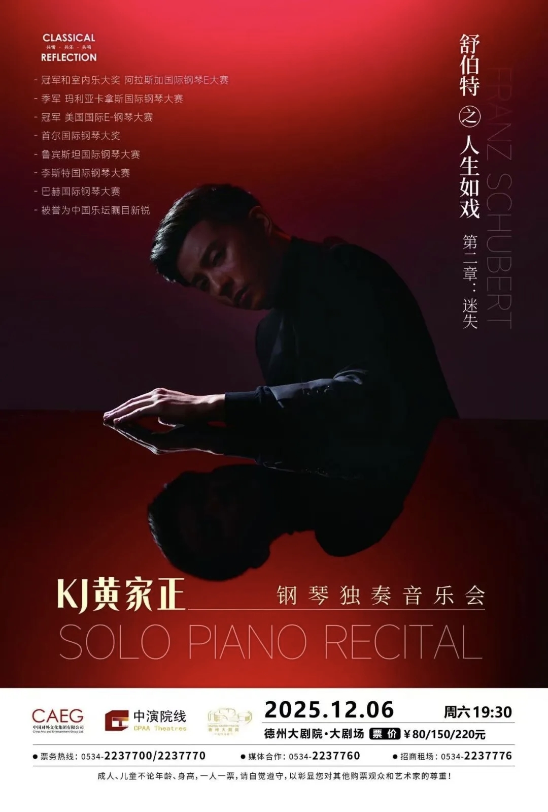本次演出季星光璀璨,每场演出均实力拉满。12月6日,国际钢琴大赛冠军得主、“中国乐坛新锐力量”KJ黄家正将率先登台,带来《舒伯特之人生如戲》钢琴独奏音乐会,以独特演绎诠释经典。