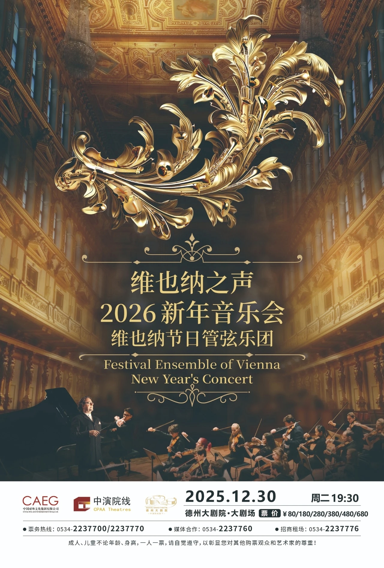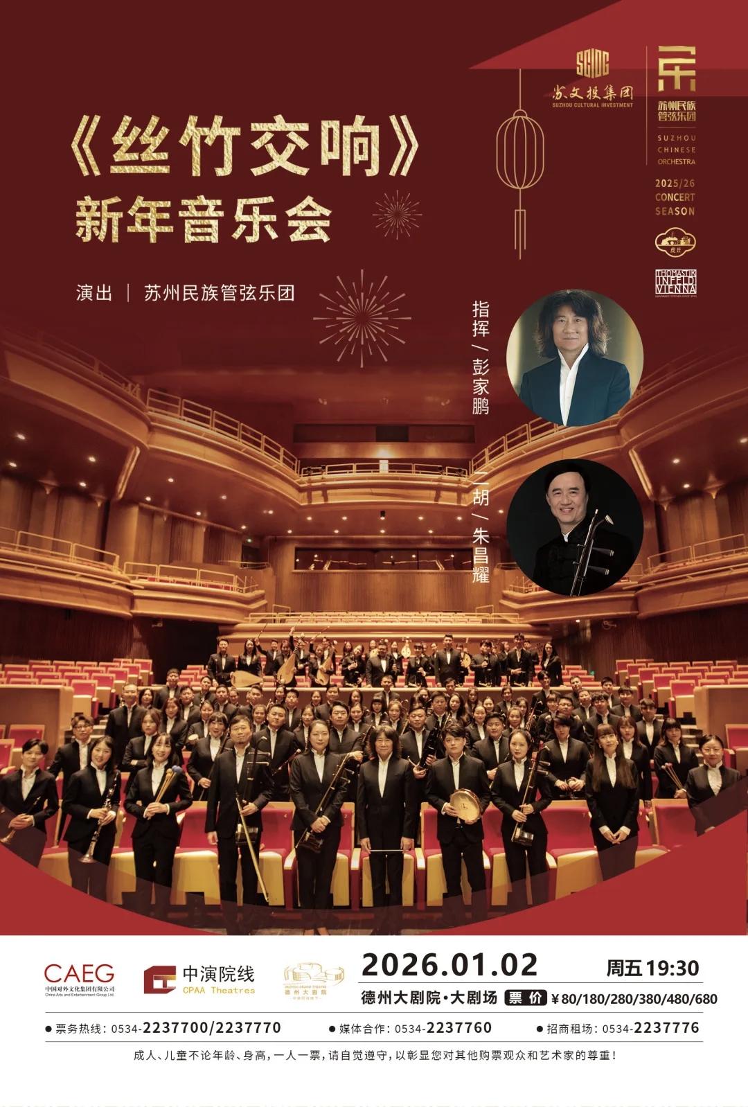 2025年12月30日,维也纳节日管弦乐团将带来《维也纳之声2026新年音乐会》,融合欧洲古典与奥地利民俗风情,奏响新年祝福。2026年1月2日,著名指挥家彭家鹏执棒、二胡名家朱昌耀助阵的苏州民族管弦乐团,将献上《丝竹交响》新年音乐会,尽显民族音乐魅力。