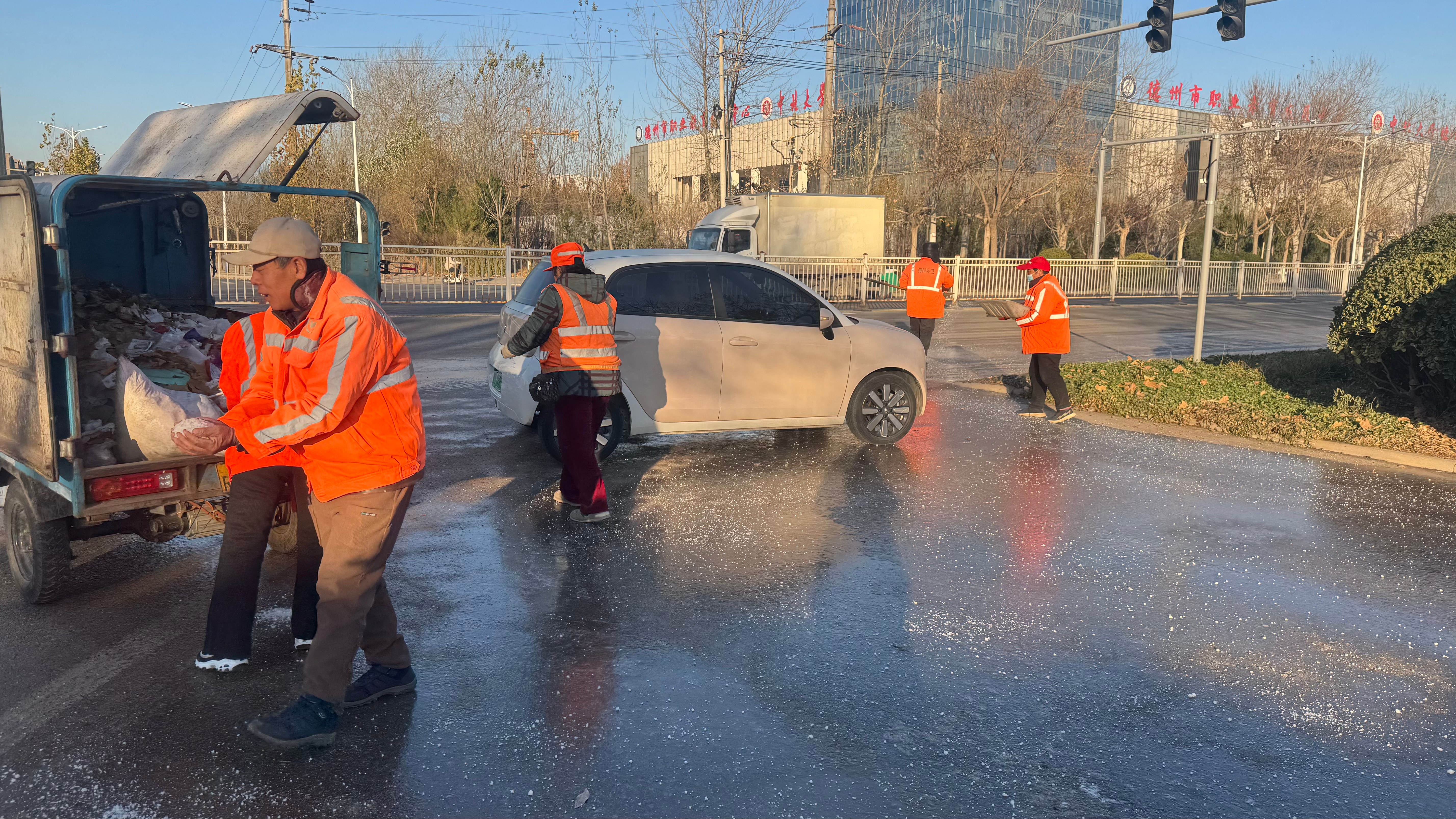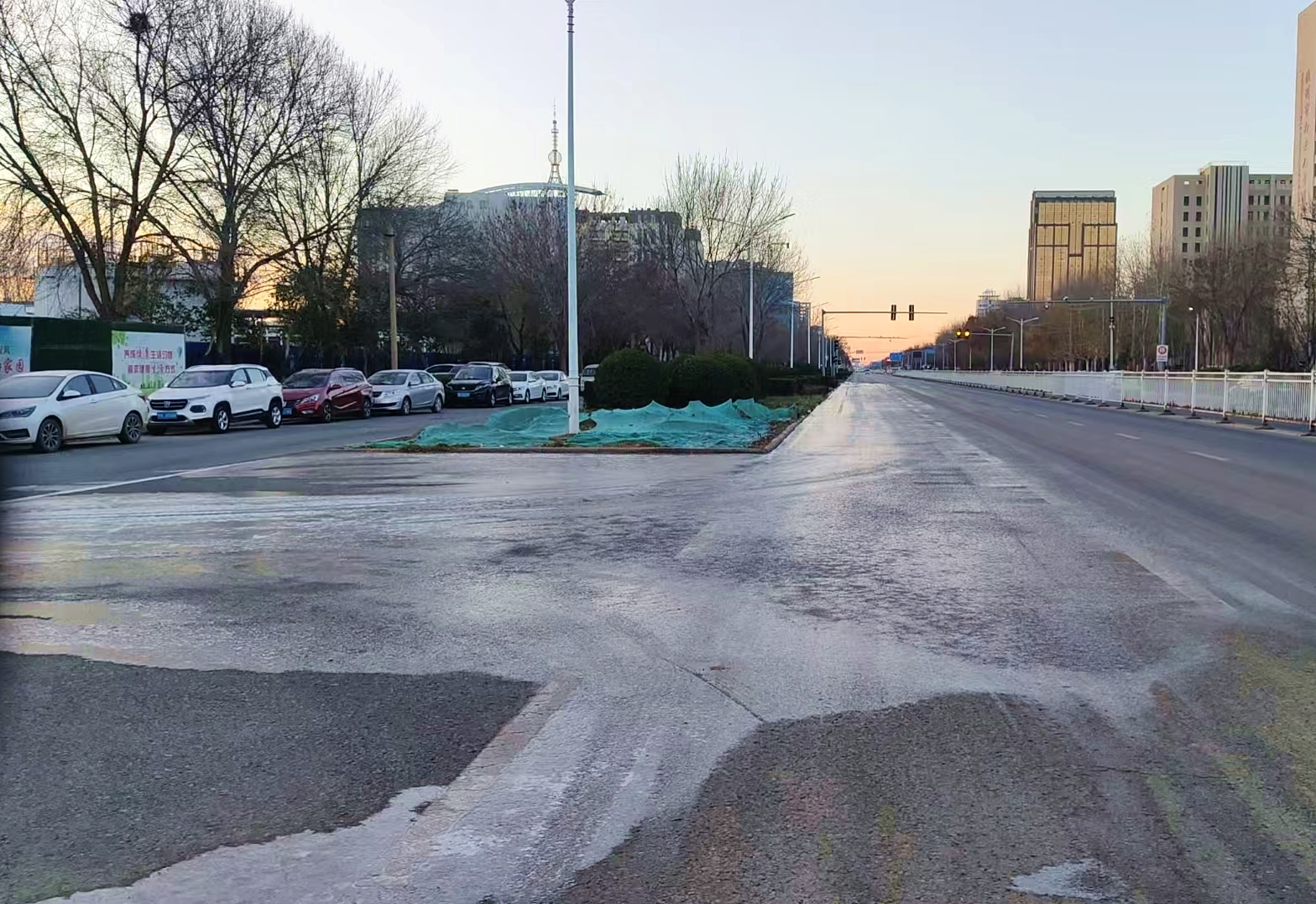 12月5日清晨,受低温天气影响,德州市天衢新区康博大道教育路口国家管网山东分公司门前路段,因施工冲水导致主路出现约200米长的薄冰,影响过往行人和车辆通行安全,存在极大安全隐患。