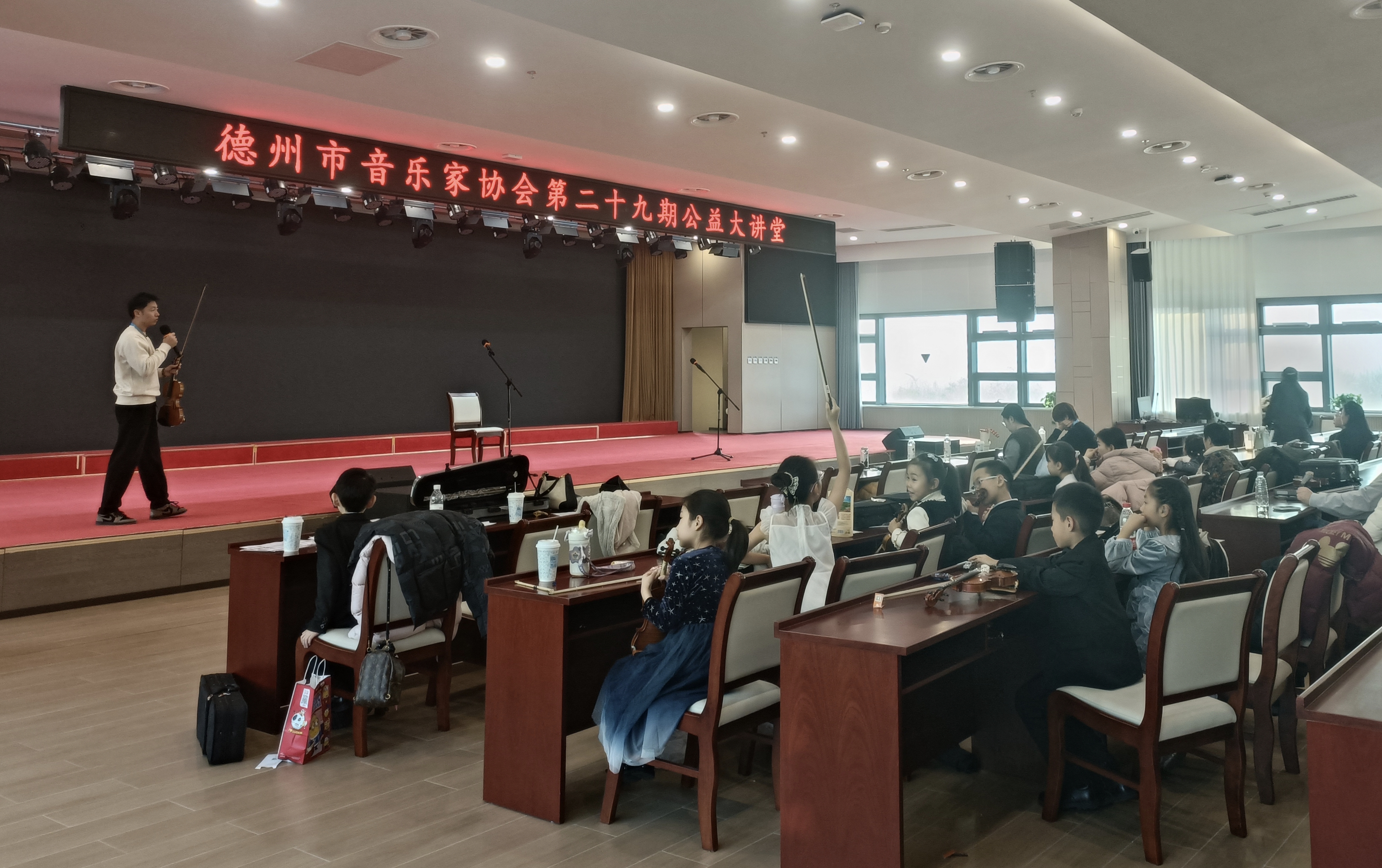 2025年12月28日,由德州市音乐家协会主办、德州市工人文化宫承办的第29期公益大讲堂在工人文化宫温情启幕。本期活动特邀市音协副主席曲鹏玮老师担任主讲人,以“夯实基础、提升合奏能力”为核心主题,为小提琴琴童们带来了一堂专业又实用的音乐指导课。