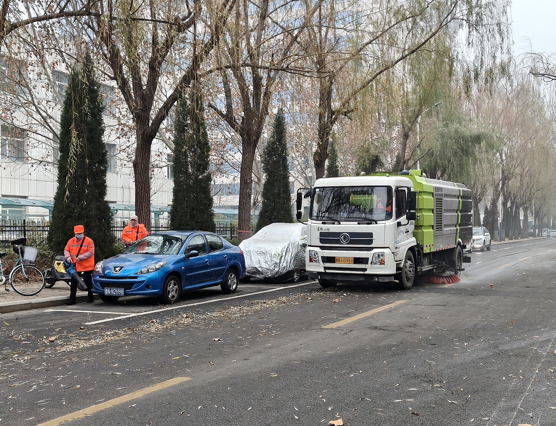 背街小巷因道路狭窄、车辆停放密集,停车位底部极易成为落叶、纸屑、烟头等细小垃圾的“藏身之处”。传统人工清扫方式受空间限制,不仅效率低下,还难以彻底清除垃圾杂物,成为环境卫生保洁的难点。针对这一问题,环卫中心坚持问题导向,深入调研作业痛点后,利用小型吹风机等专项设备,重构保洁作业流程,打造出一套针对性强、可落地的作业方案。