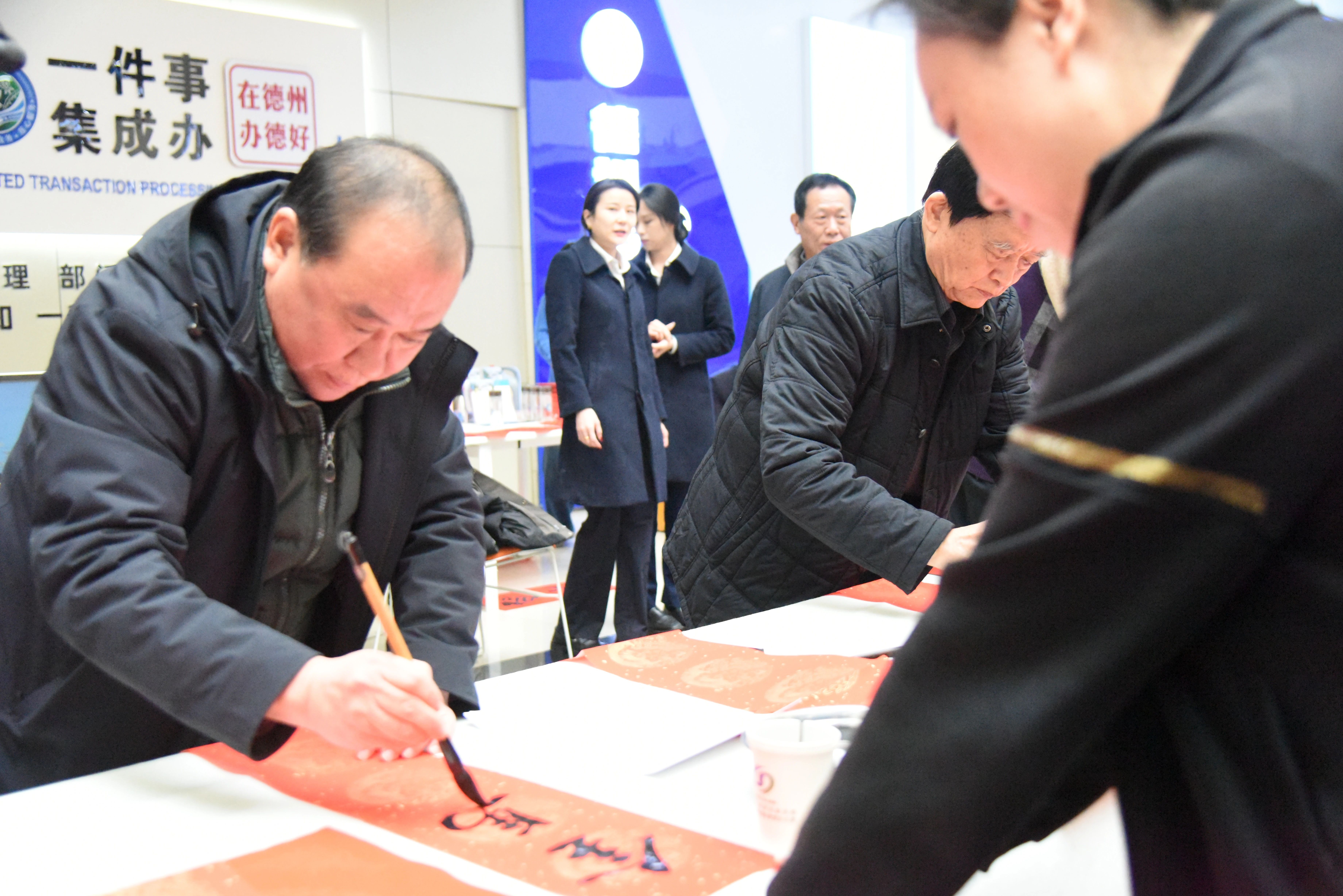 本次活动特邀德州市书协老年书法家工委的书法家现场挥毫,为办事群众免费书写春联、绘制国画。活动现场墨香四溢、暖意融融,红幅铺展、笔墨齐备,书法家们凝神运笔、挥洒自如,一撇一捺间尽显书法韵味。“福满家门添顺意,春临政务暖民心” 等一副副兼具美好新春祈愿与暖心政务温度的对联,一个个饱满喜庆、遒劲有力的 “福” 字,一幅幅笔墨生动的国画跃然纸上,将真挚的新春祝福凝于笔尖、融于纸间。