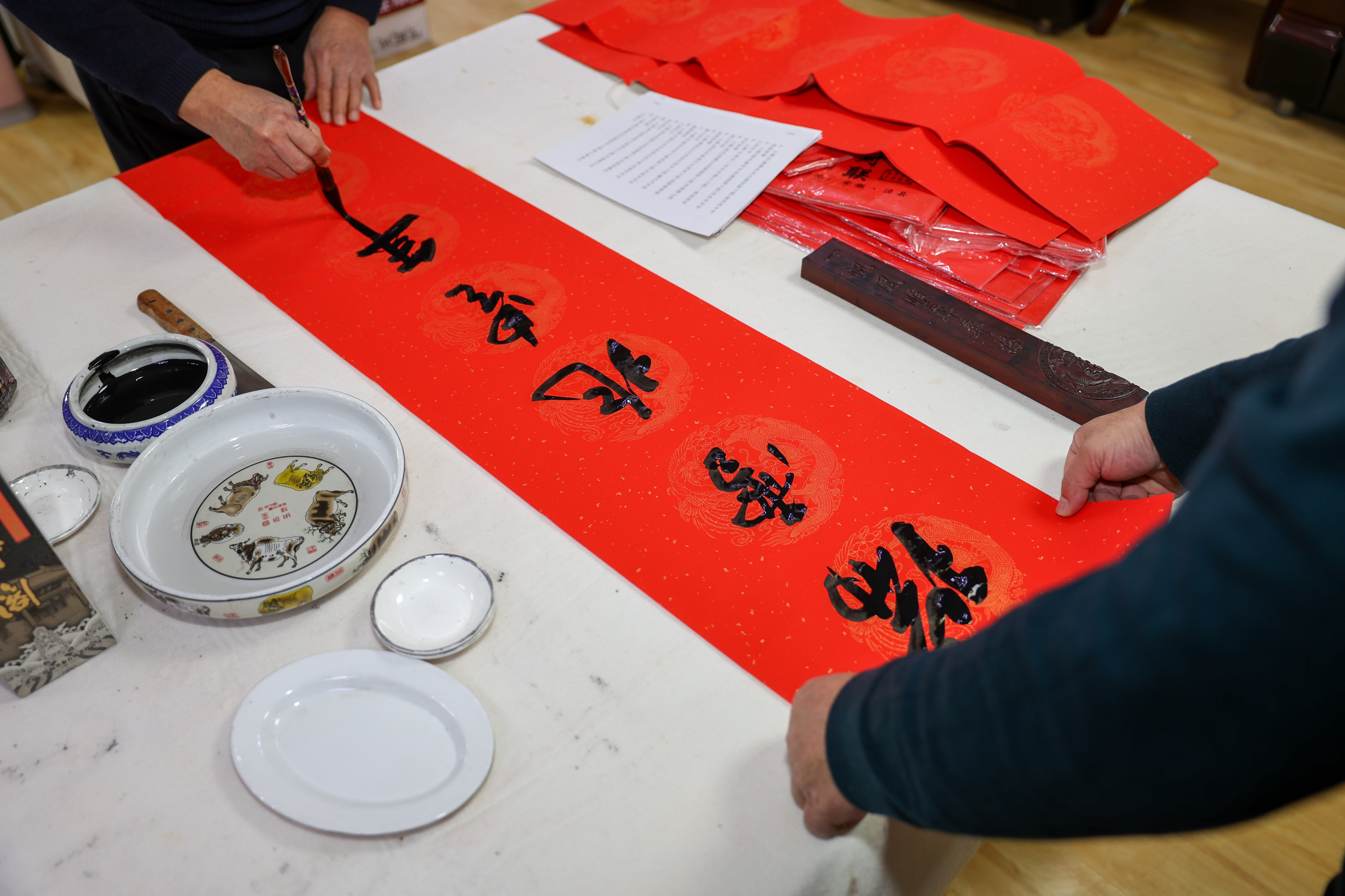 活动现场墨香四溢,暖意融融。来自书道老友、市书法家协会老年书法家工作委员会的十多位书法家铺纸运笔,挥毫泼墨,一幅幅寓意吉祥的春联和苍劲有力的“福”字跃然纸上。“勇为正气昭日月,义举仁风暖乾坤”“德耀州城扬正气,春临禹域颂英模”……红纸黑字间既寄托着对新春的美好祝愿,更蕴含着对见义勇为英雄的崇高敬意。