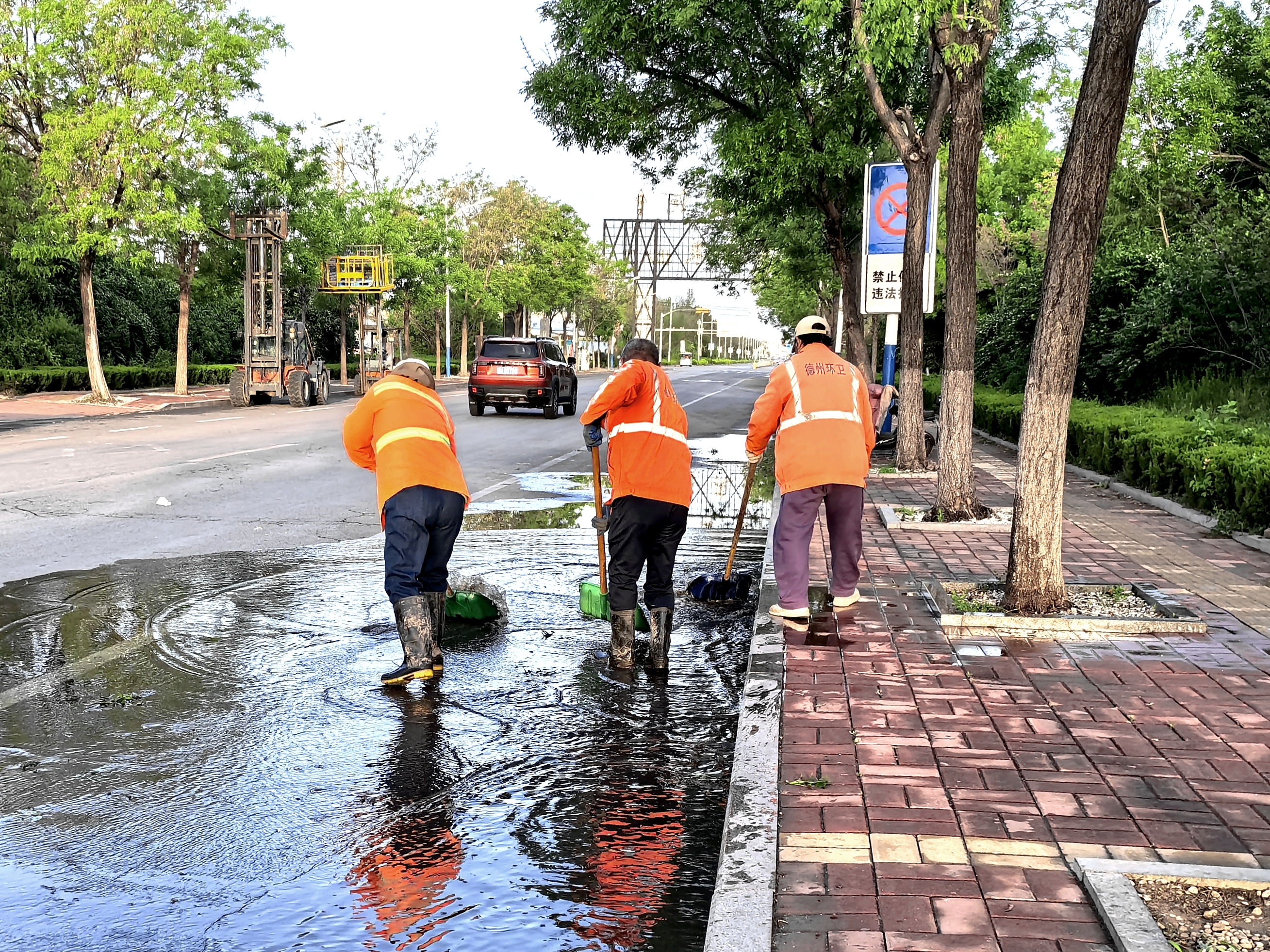 强对流天气过后,环卫中心迅速摸排积水路段、杂物堆积点、排水设施堵塞等重点问题,随即统筹调配人力、机械资源,明确作业分工、细化工作标准,全体作业人员投入雨后清理工作,争分夺秒消除天气对辖区环境带来的影响。