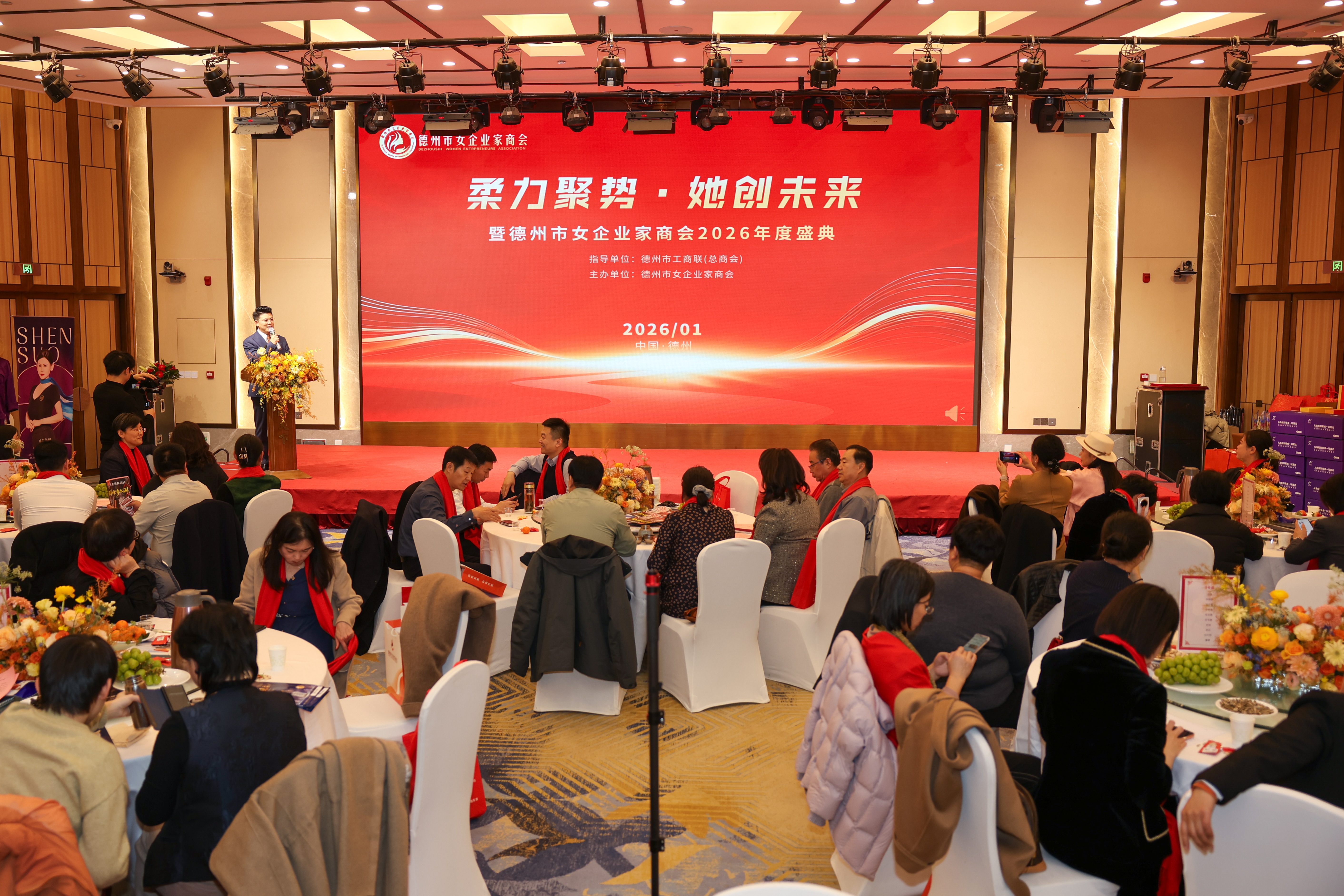 1月23日,岁序更替、华章日新,柔力聚势她创未来2026年德州市女企业家商会年会在东海天下酒店正式启幕。活动现场同步设置年货市集,集中展