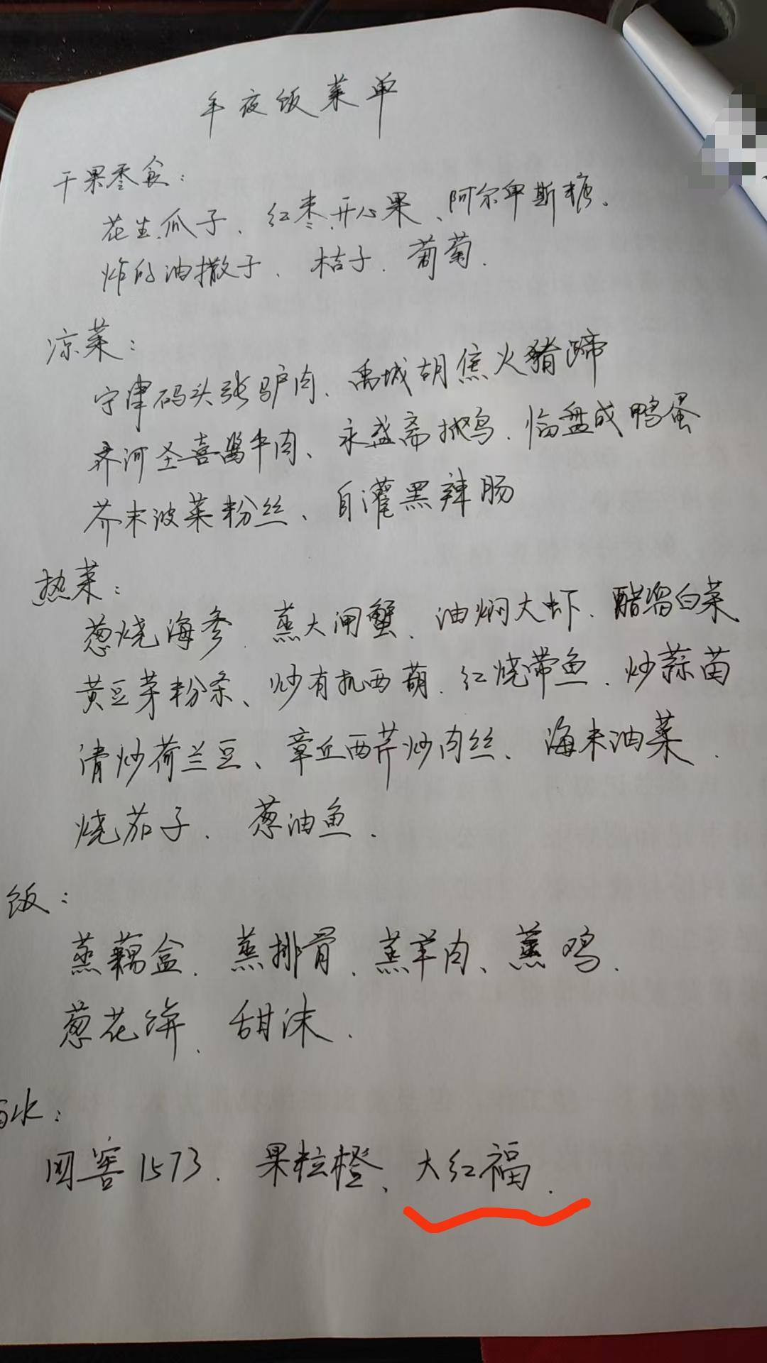 近日,一张德州家庭的手写年夜饭菜单引发网友关注。菜单中,宁津驴肉、德州扒鸡、齐河酱牛肉等本地非遗美食,与奥德曼酒庄大红福生肖红酒等