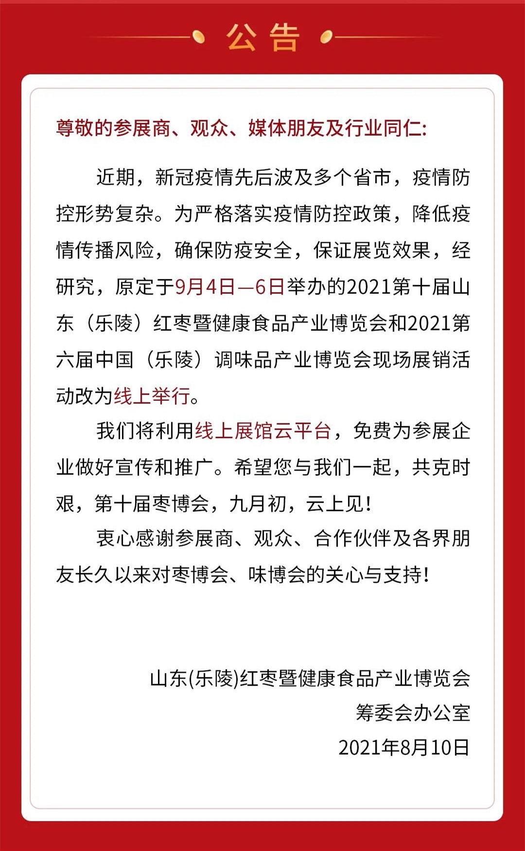 8月10日,山东(乐陵)红枣暨健康食品产业博览会筹委会办公室发布公告,经科学研判近期疫情防控新形势,原定于9月4日至6日举办的2021第十届山东(乐陵)暨健康食品产业博览会和2021第六届中国(乐陵)调味品产业博览会现场展销活动改为线上活动。