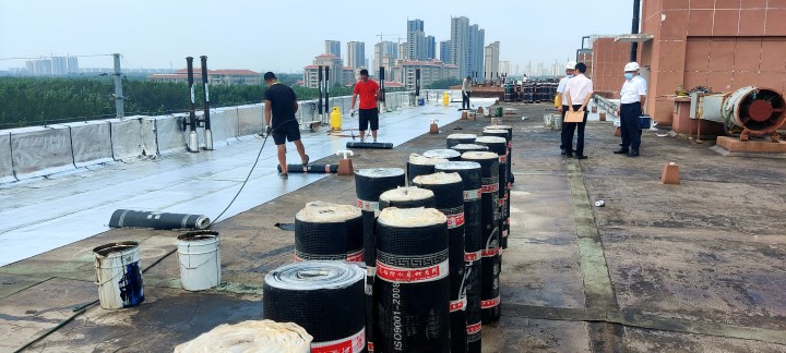 8月17日,在德州市第一中学宿舍楼上,来自德州交投新能源有限责任公司的施工人员正在为楼顶做防水,为安装光伏发电项目做准备。该项目共布置1340块460Wp单晶硅光伏组件,预计总装机容量616.4KW,被德州市第一中学给出“满意”评级。