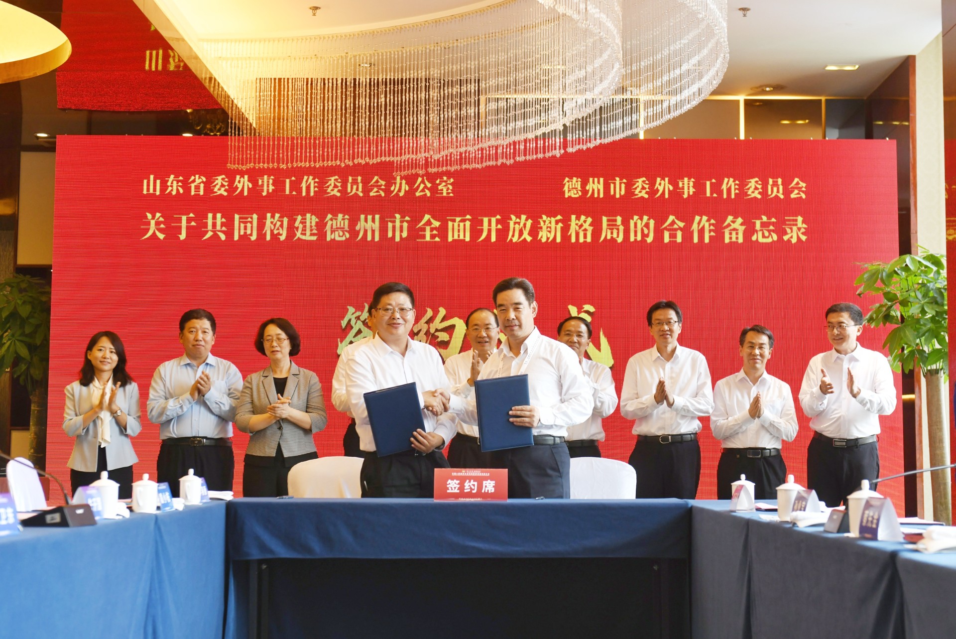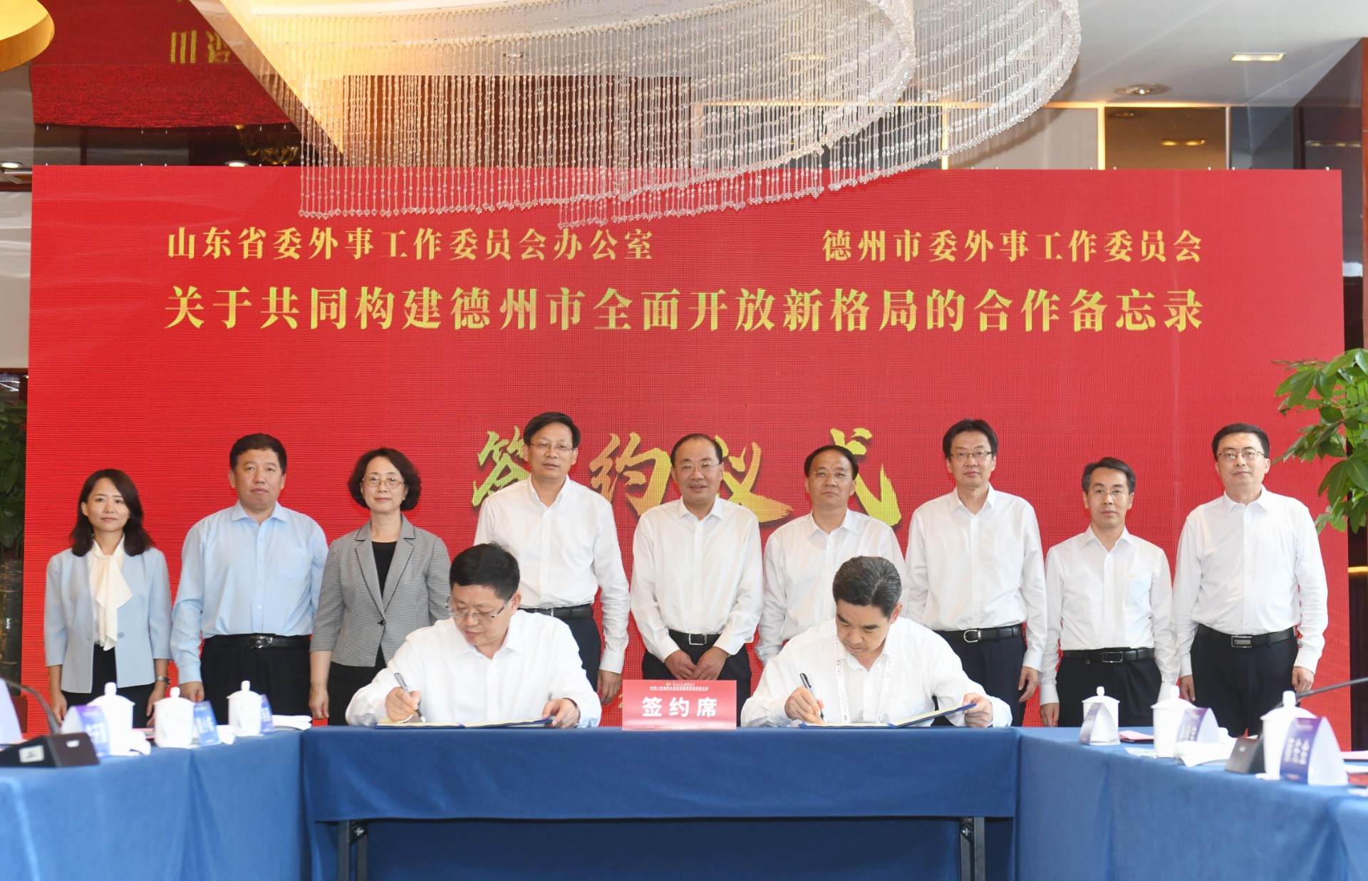7 月28日,山东省委外事工作委员会办公室与德州市委外事工作委员会签署《关于共同构建德州市全面开放新格局的合作备忘录》。德州市委书记田卫东,省委外办主任、省人民对外友好协会会长蔡先金在签约仪式上讲话。