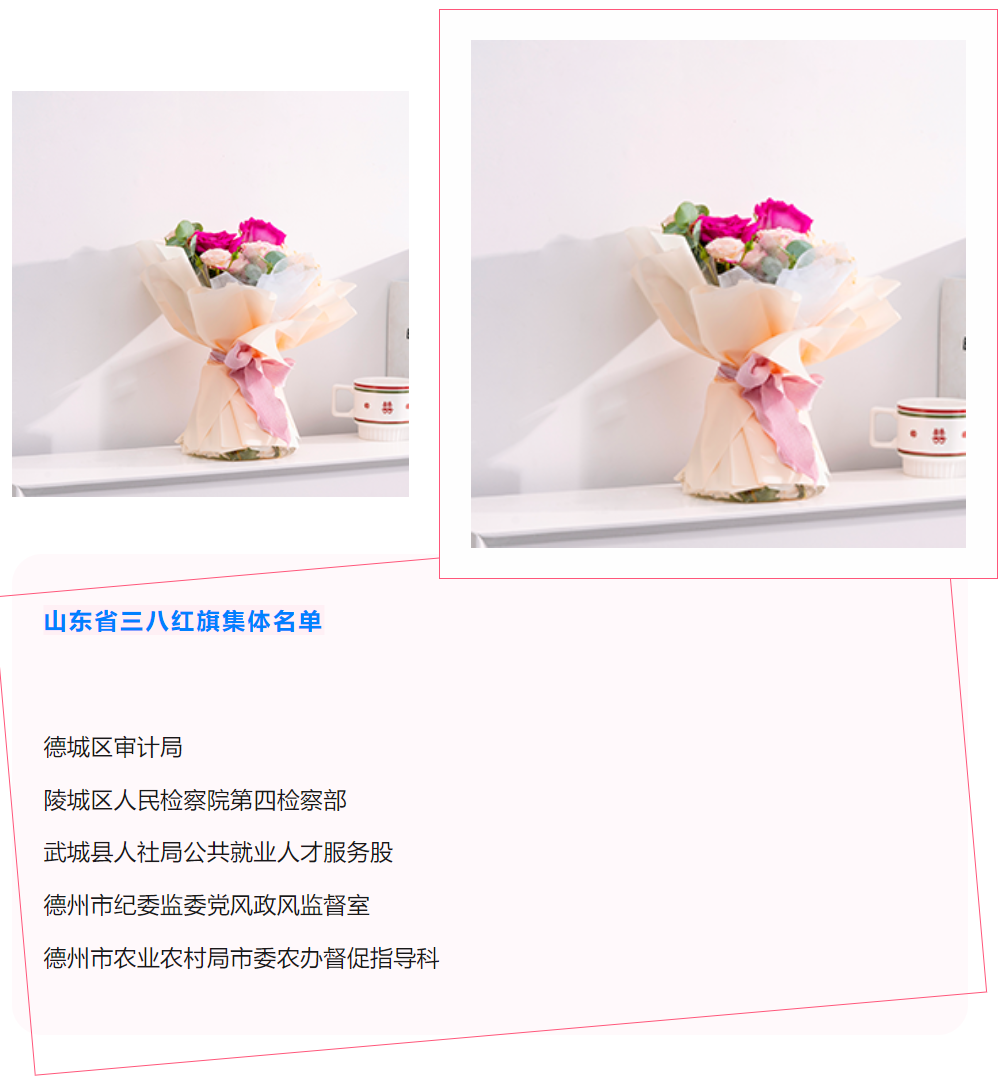 日前,山东省妇联授予10名个人山东省三八红旗手标兵称号、190名个人山东省三八红旗手称号、100个集体山东省三八红旗集体称号。我市8名个人、5个集体入选。