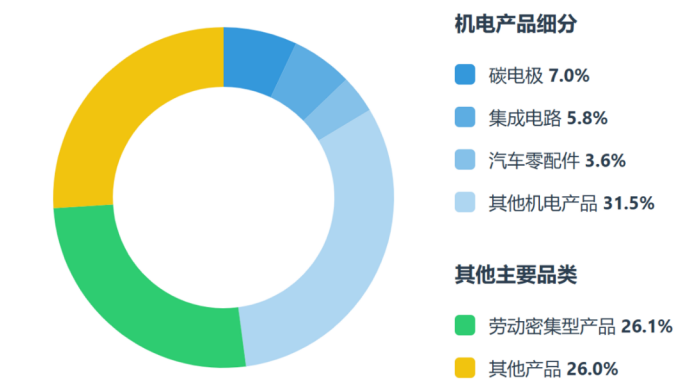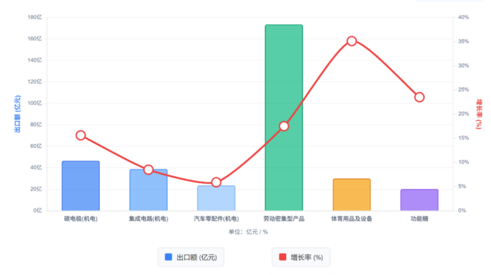 三是出口结构持续优化,传统与新兴产品齐头并进。机电产品作为最大出口品类,出口318.1亿元,增长6.9%,占德州市出口总值的47.9%。其中,碳电极出口46.5亿元,增长15.6%;集成电路出口38.8亿元,增长8.5%;汽车零配件出口23.6亿元,增长5.9%。劳动密集型产品出口173.4亿元,增长17.5%,纺织服装、塑料制品出口增速均超过32%。此外,体育用品及设备出口30亿元,增长35.1%;功能糖出口20.2亿元,增长23.5%,特色产业优势突出。