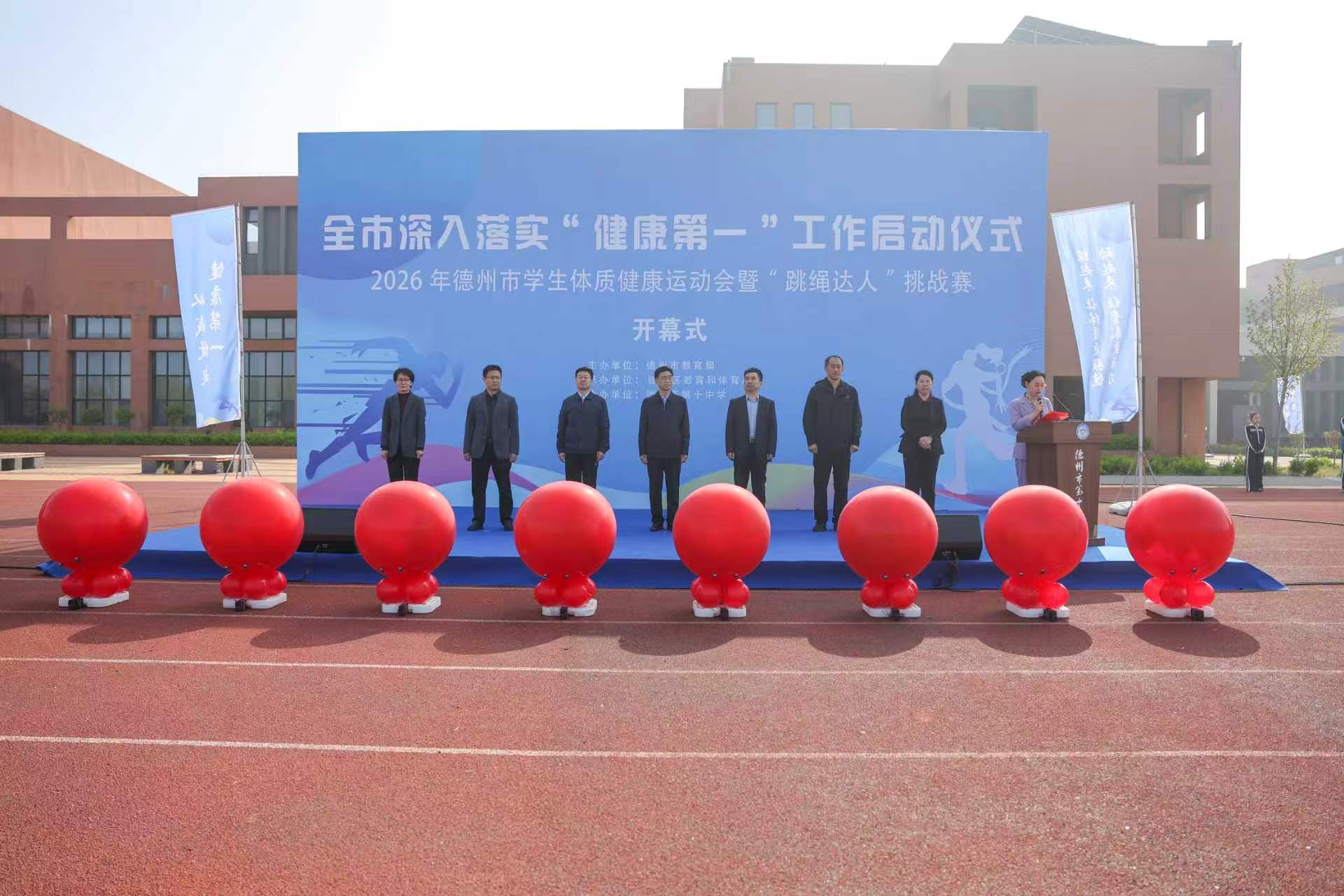 4月10日,德州市“健康第一”工作启动仪式、2026 年学生体质健康运动会暨“跳绳达人”挑战赛,在德州市第十中学宣蕙校区正式开幕。本次赛事覆盖小学、初中、高中三个学段,全市12个县市区与4所市属高中选派300余名学生参赛,以体育竞技展现青少年健康风采。