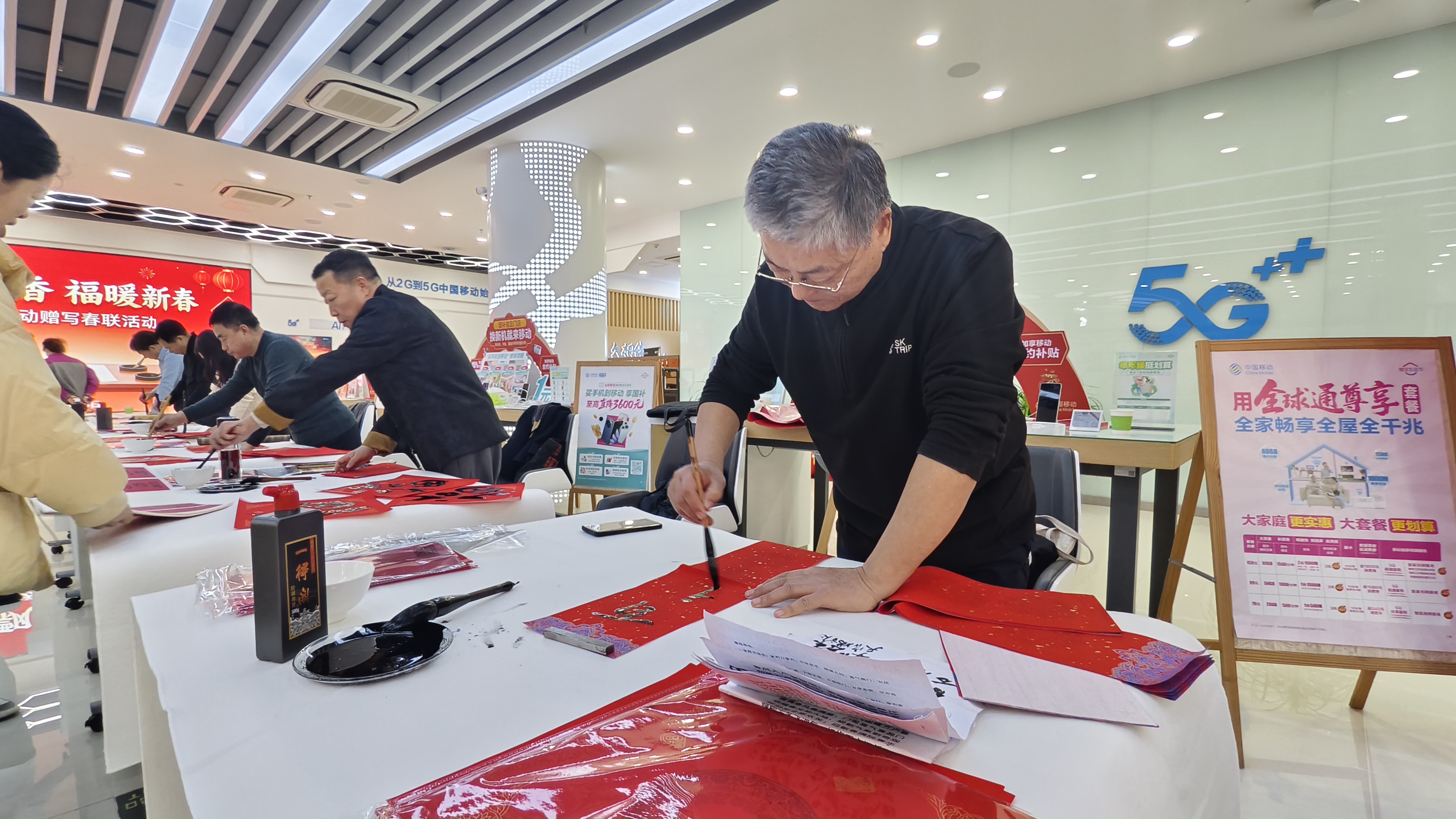 德城东风东营业厅在其打造的“书香移动”特色服务体验区设置了传统文化体验环节,客户在办理业务之余,可现场感受书法挥毫的雅致,在笔墨书香中品味传统年俗,尽享新春雅趣。天衢康博大道营业厅则特邀书法家协会的老师们开展“万福迎春”惠民活动,书法家们现场挥毫泼墨,书写福字与春联。墨香四溢间,一幅幅充满力量与祝福的作品应运而生。这些饱含深情的墨宝被免费赠送给到厅客户,在传递新春祝福的同时,也弘扬了中华优秀传统文化,让客户在墨香中感受中华文字的博大精深与传统节日的深厚底蕴。